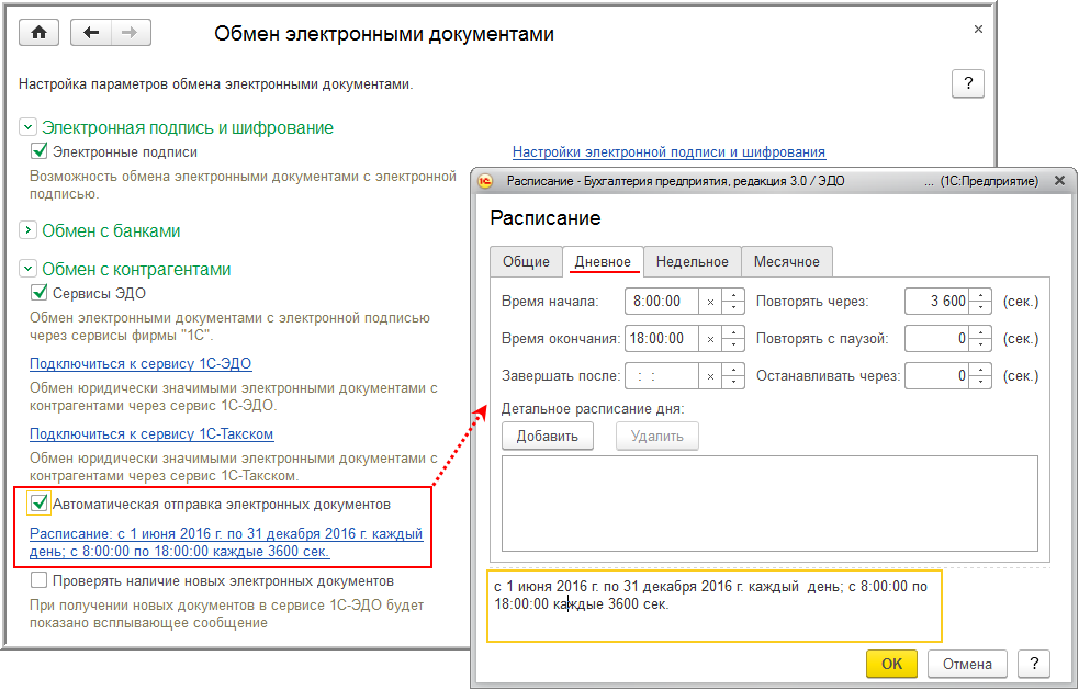 Можно установить расписание отправки электронных документов, выполнив соответствующую настройку параметров обмена электронными документами с контрагентами (раздел Администрирование - гиперссылка Обмен электронными документами) (рис. 17).
