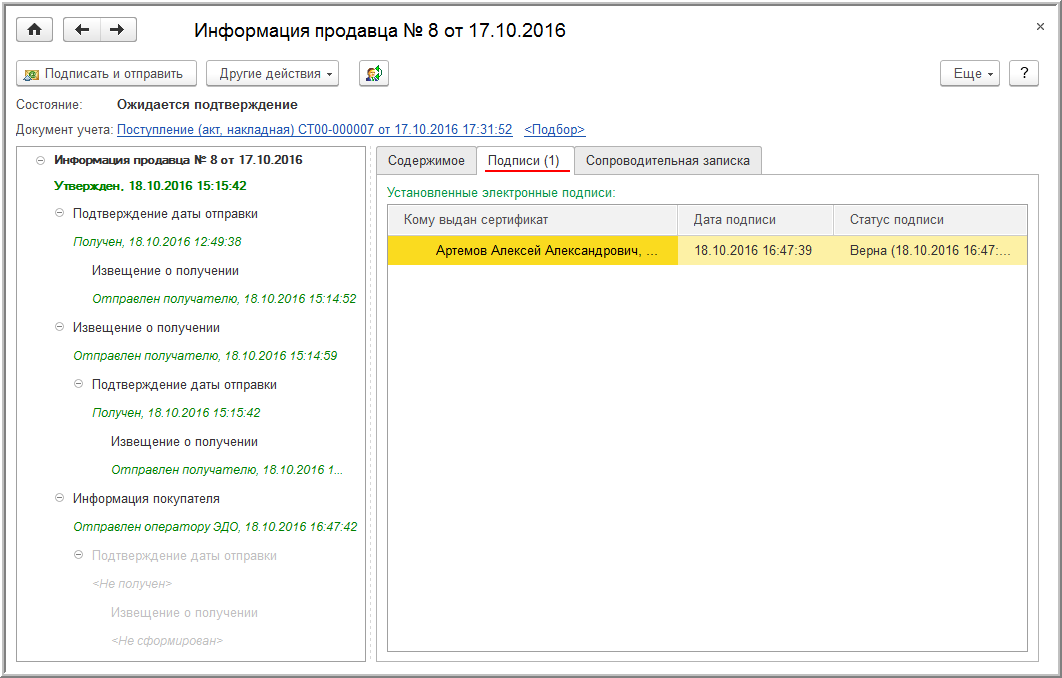 На соответствующих закладках формы просмотра поступившего электронного УПД отражается информация о подписях и статусах электронного документа (рис. 6), а также текст сопроводительной записки при ее наличии.