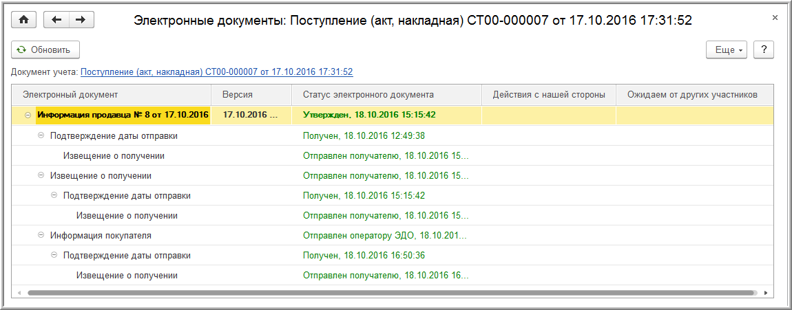 Кроме того, подробную информацию о том, какие действия необходимо выполнить покупателю со своей стороны в отношении поступившего документа, а также о требуемых действиях со стороны других участников обмена, можно увидеть в форме "Электронные документы" (Таблице состояния) (рис. 8), открываемой по гиперссылке информационной строки или по команде Открыть электронные документы из списка команд, открываемого по кнопке ЭДО, документа "Поступление (акт, накладная)" (рис. 7).