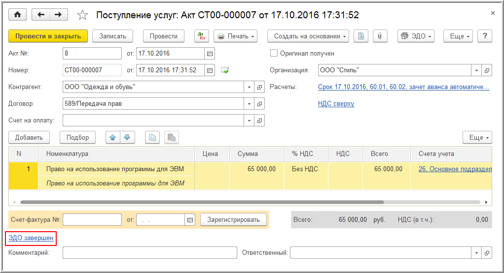 После завершения обмена электронным УПД в строке состояния документа "Поступление (акт, накладная)" будет отражена информация "ЭДО завершен" (рис. 23).