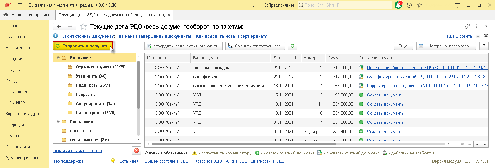 Получение электронного УПД(СЧФДОП) от продавца происходит по команде Отправить и получить из формы списка документов "Текущие дела ЭДО", открываемого по гиперссылка панели команд Текущие дела ЭДО (раздел Администрирование - подраздел Сервис или раздел Руководителю - подраздел Сервис, или раздел Продажи - подраздел Сервис) (рис. 1).