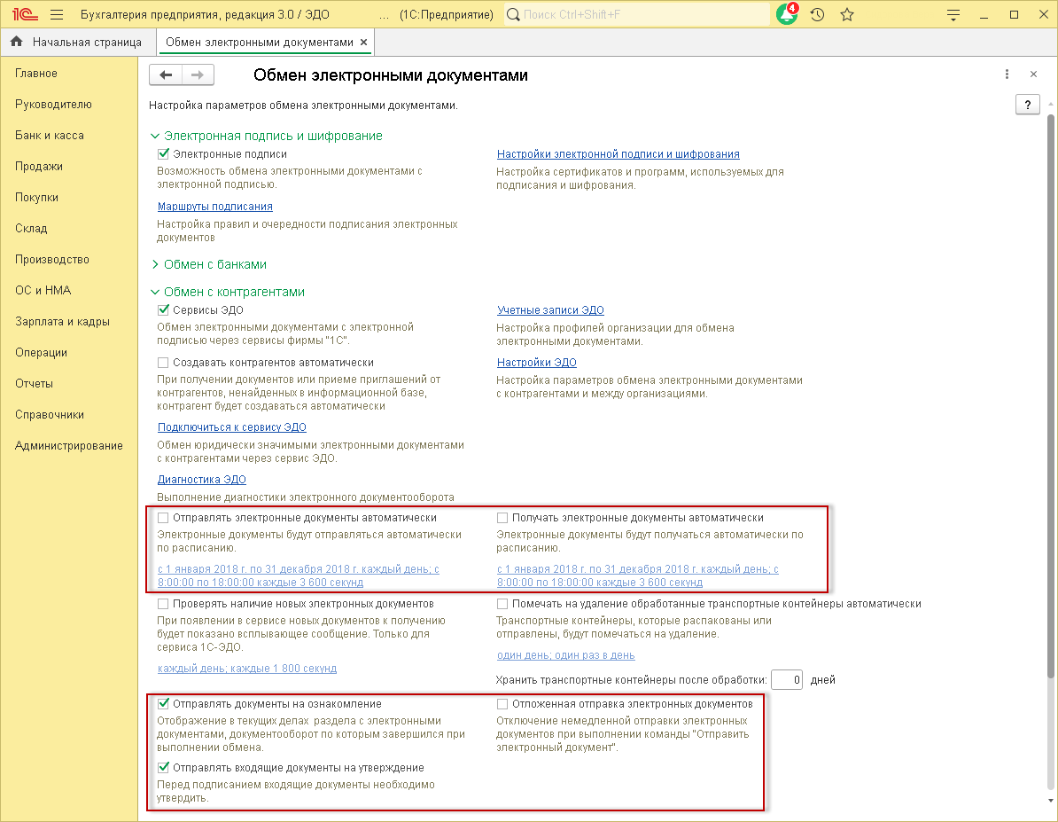 Также можно установить расписание получения электронных документов, выполнив соответствующую настройку параметров обмена электронными документами с контрагентами (раздел Администрирование - Обмен электронными документами) (рис. 2).
