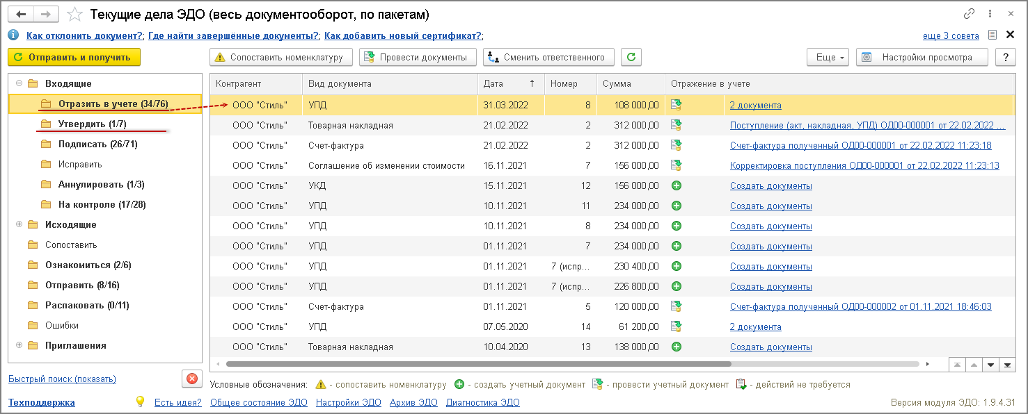 - по гиперссылке в графе "Отражение в учете" в активной строке списка документов "Текущие дела ЭДО" (рис. 3);