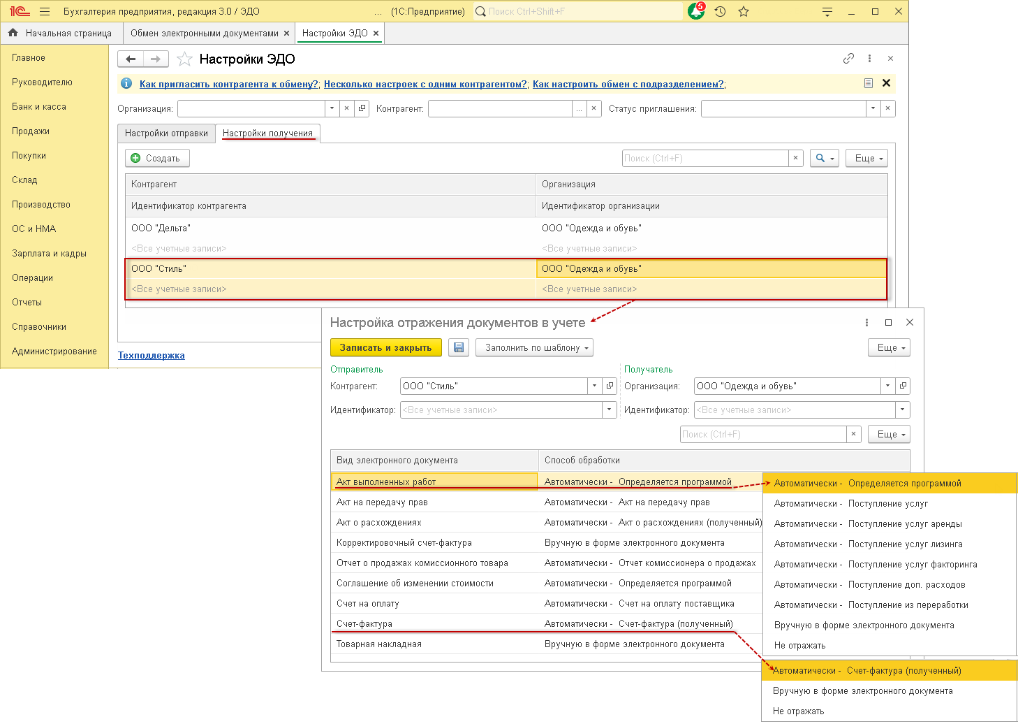 Таким образом, при выборе автоматического способа отражения (рис. 4) при получении УПД(СЧФДОП) будут созданы два документа учета: "Поступление (акт, накладная, УПД)" и "Счет-фактура полученный". При этом в соответствующей активной строке в графе "Отражение в учете" списка документов "Текущие дела ЭДО" появится гиперссылка на автоматически созданные документы - 2 документа (рис. 3).