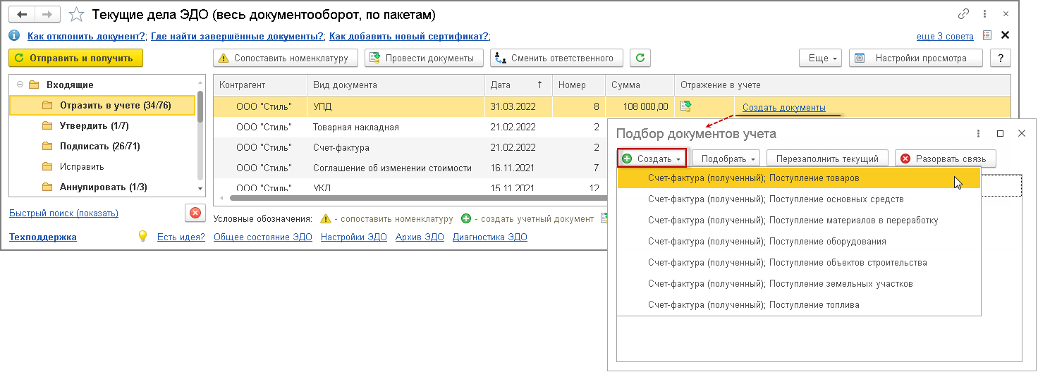 Если в настройках получения будет стоять способ обработки "Вручную в форме электронного документа", то при получении электронного документа в папке "Отразить в учете" в графе "Отражение в учете" будет стоять гиперссылка со значением Создать документы, при переходе по которой откроется форма "Подбор документов учета", в которой можно по кнопке Создать сформировать соответствующий документ в учетной системе или по кнопке Подобрать соотнести полученный электронный документ с соответствующим документом учетной системы (рис. 5).
