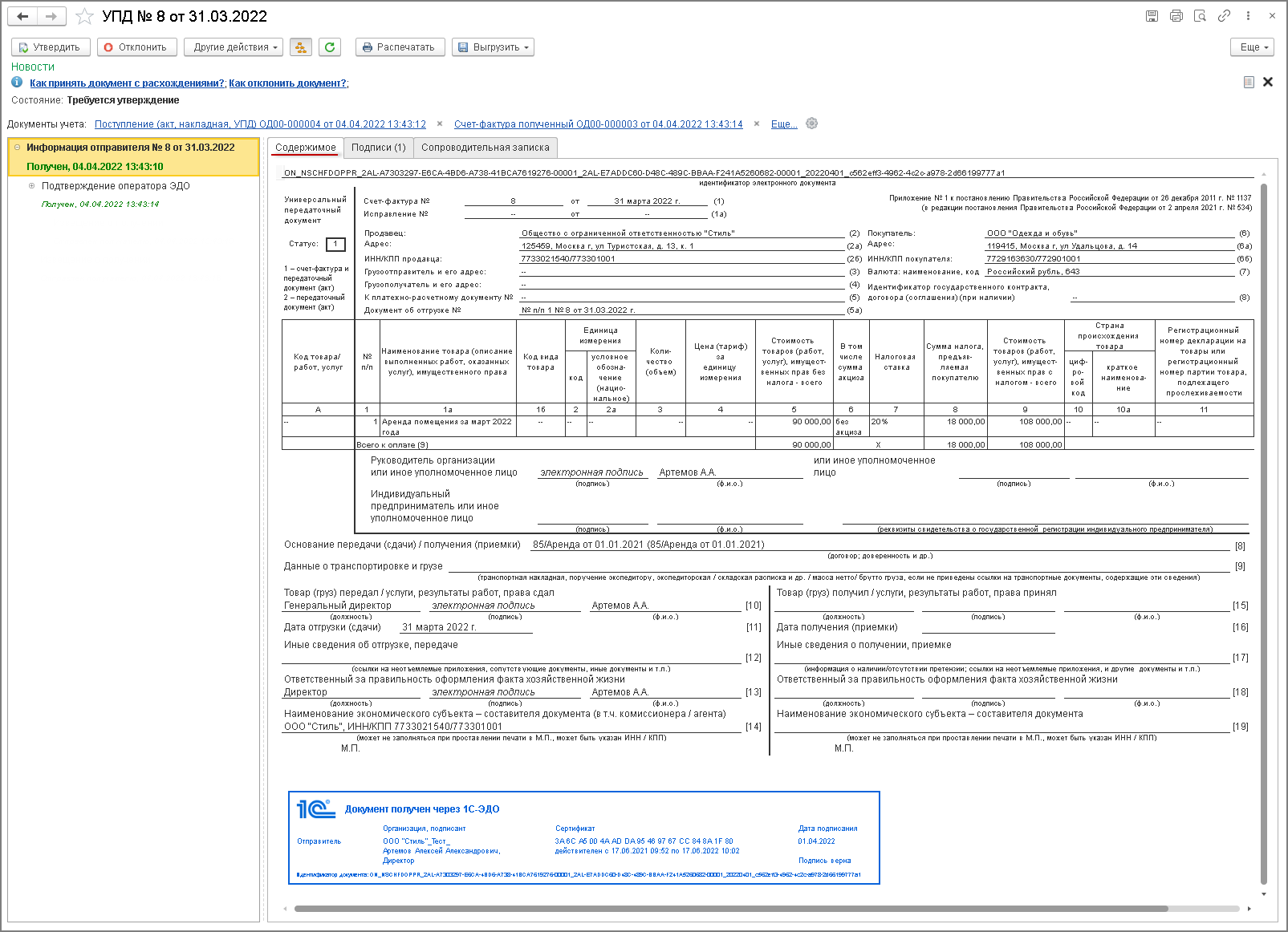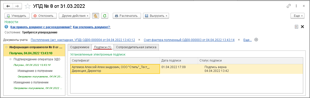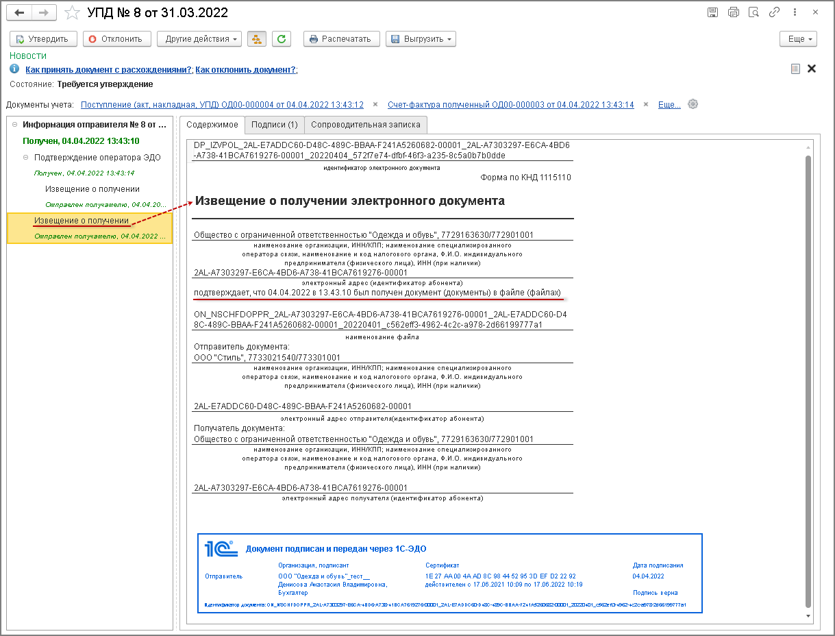 Если у текущего пользователя есть право подписи и сертификат подписи установлен на компьютере, то извещение о получении УПД(СЧФДОП) будет также автоматически подписано и отправлено оператору ЭДО. Если у текущего пользователя права подписи нет, то сформированное извещение будет направлено на подпись лицу, имеющему такое право.