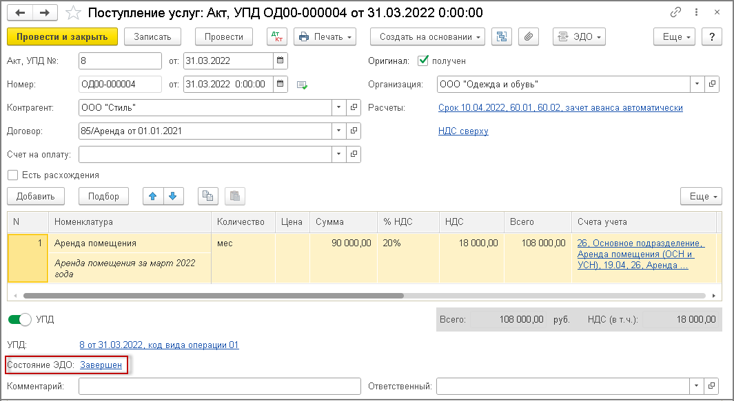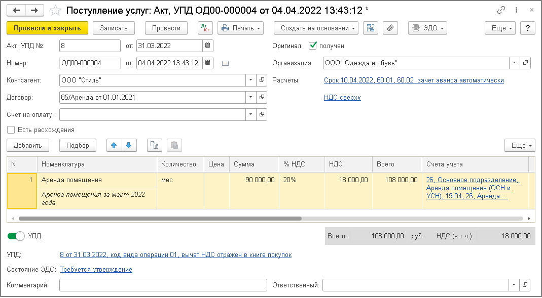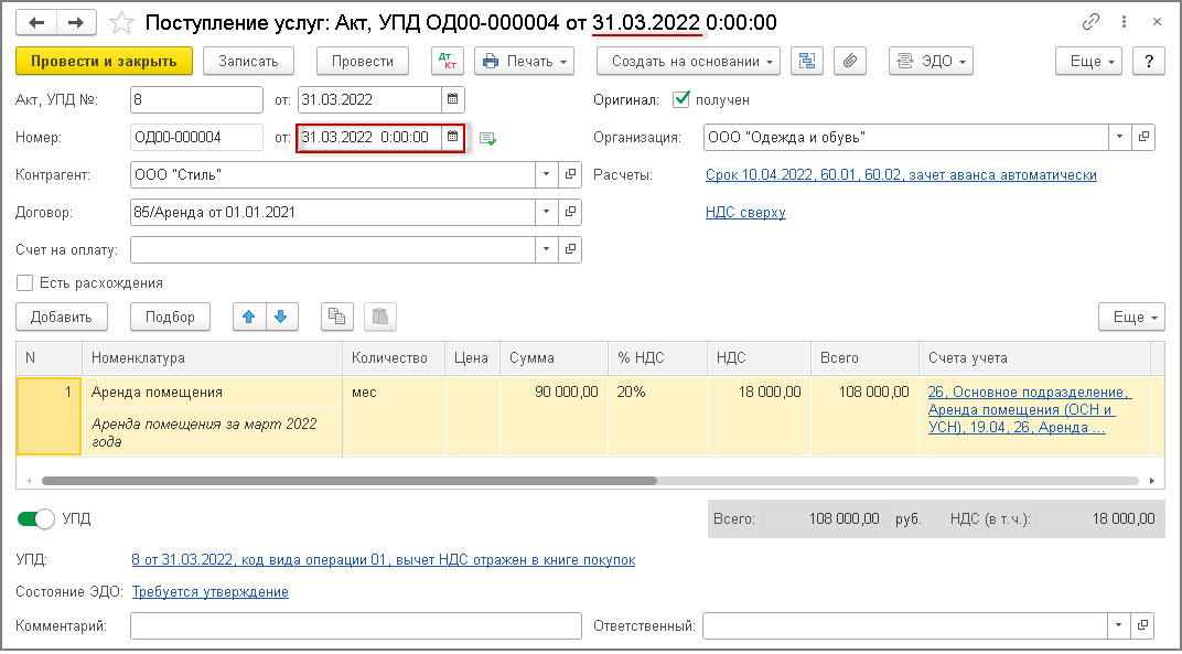 Поскольку электронный документ поступил в организацию 04.04.2022, то и новый документ учетной системы "Поступление (акт, накладная, УПД)" будет автоматически сформирован датой 04.04.2022. В то же время поскольку услуга по аренде помещения фактически оказывалась в марте 2022 года (о чем свидетельствует и содержание графы "Номенклатура" табличной части), то в учете арендатора такая услуга должна отражаться в периоде ее оказания независимо от даты выставления и получения соответствующего первичного учетного документа (Рекомендация Р-62/2015-КпР (принята 20.05.2015), письма Минфина России от 27.07.2015 № 03-03-05/42971, от 28.04.2016 № 03-03-06/1/24705). Поэтому необходимо в автоматически сформированном документе "Поступление (акт, накладная, УПД)" вручную заменить дату в поле "от" в строке с номером и датой регистрации документа в учетной системе на "31.03.2022" (рис. 9).