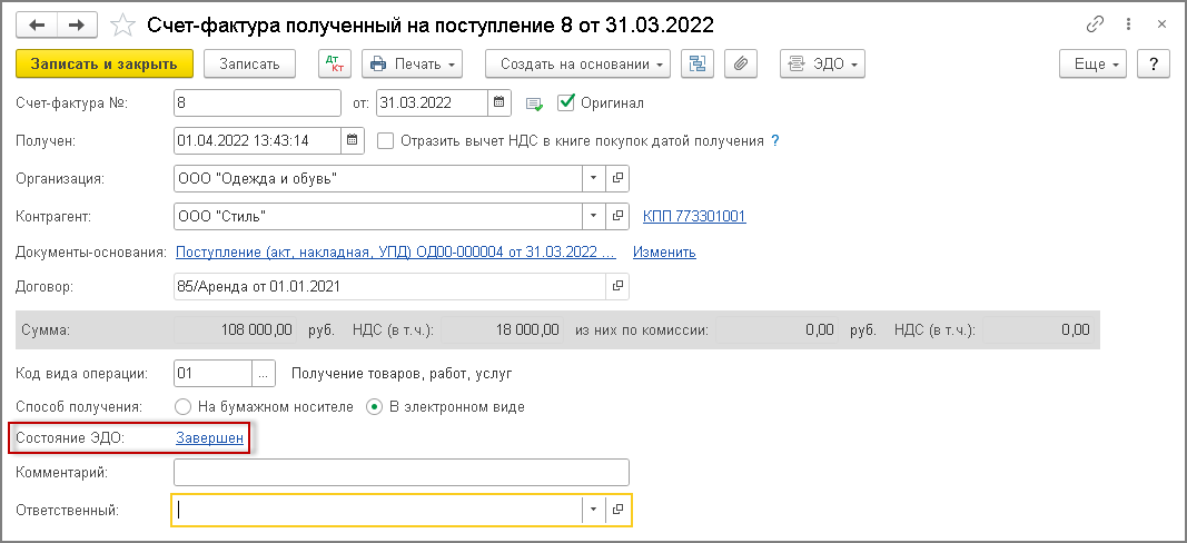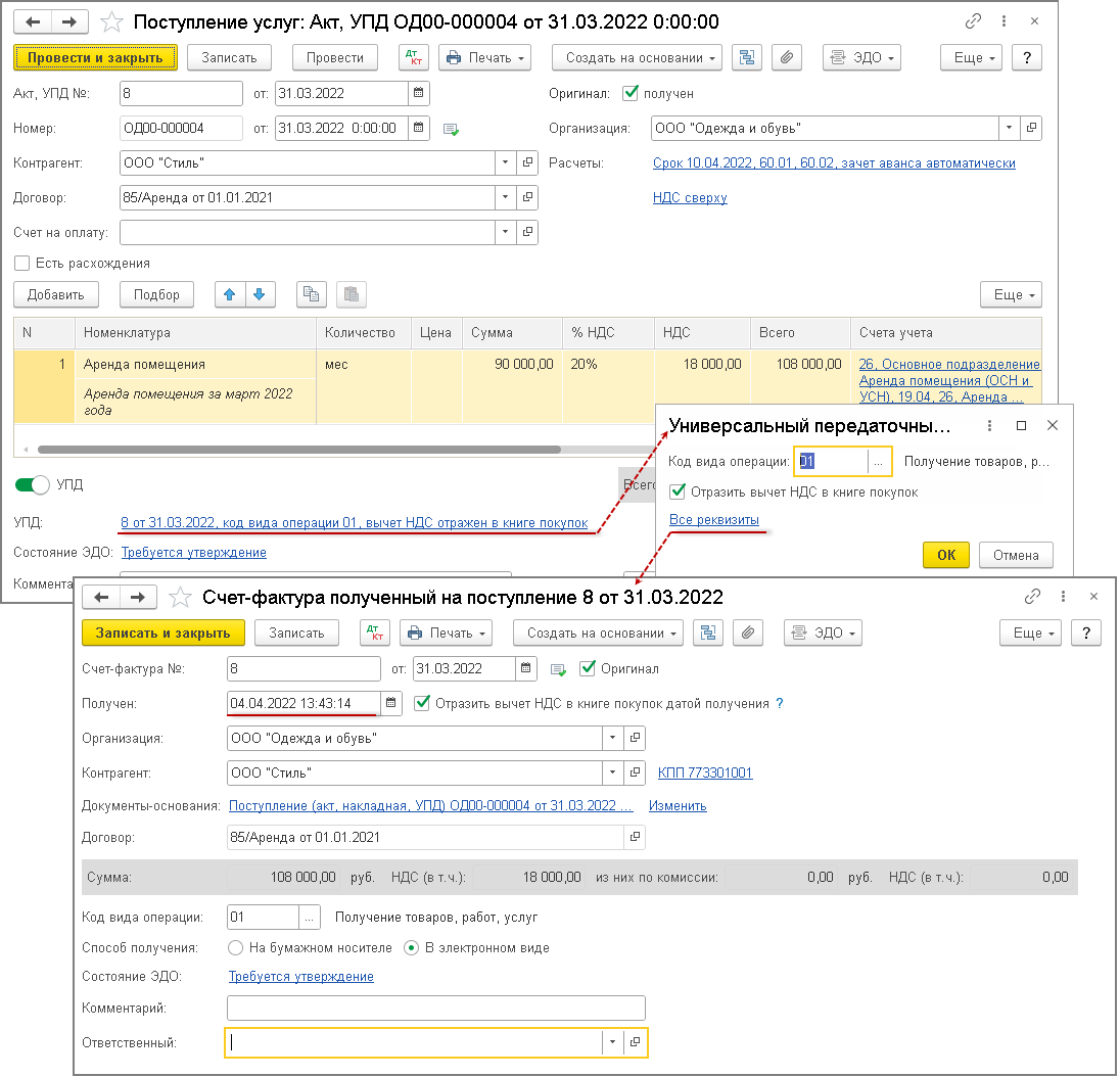 Также в учетной системе на основании поступившего электронного УПД(СЧФДОП) будет автоматически сформирован документ "Счет-фактура полученный".
