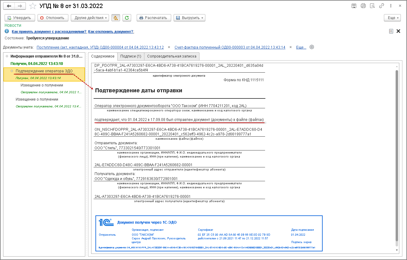 Текущее состояние обменного процесса в отношении полученного электронного УПД(СЧФДОП) отражается в информационной строке документа "Состояние ЭДО", где будет размещена гиперссылка Требуется утверждение.