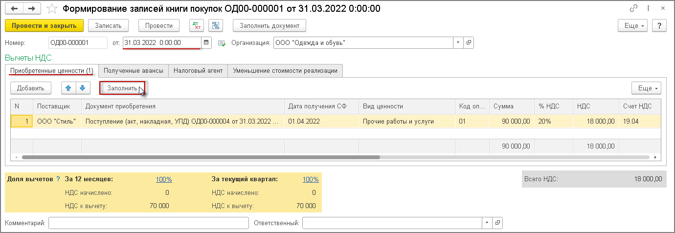 Для заявления налогового вычета в 1 квартале 2022 года, а не в периоде фактического получения счета-фактуры в составе электронного УПД(СЧФДОП), необходимо снять флажок в строке "Отразить вычет НДС в книге покупок датой получения" (рис. 10). Далее заявление налогового вычета следует производить с помощью регламентного документа "Формирование записей книги покупок" (раздел Операции - подраздел Закрытие периода - Регламентные операции НДС) (рис. 12).