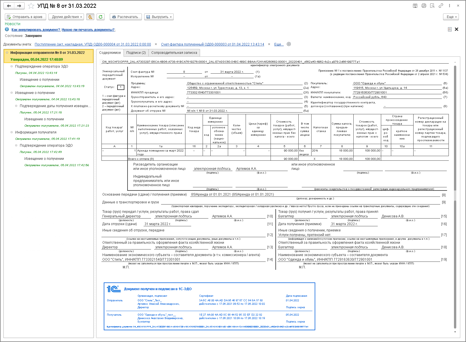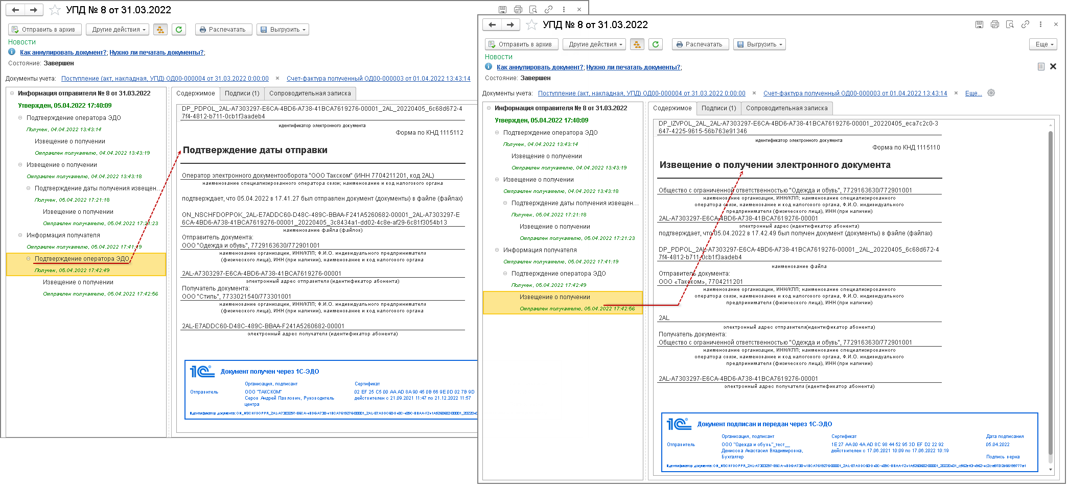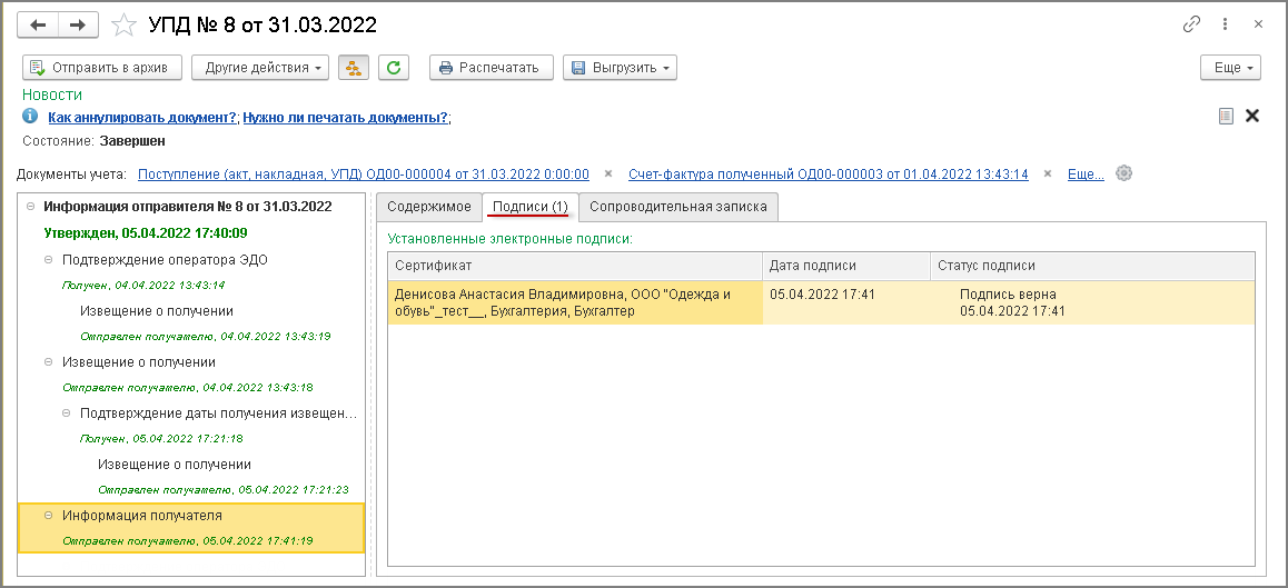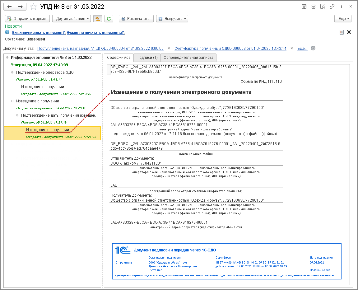 На этом обмен электронным УПД(СЧФДОП) у покупателя завершается.