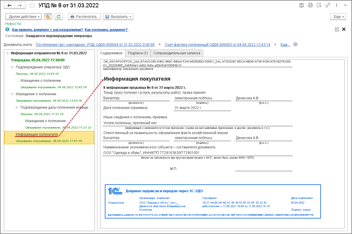 Несмотря на то, что информация покупателя формируется и подписывается 05.04.2022, в строке "Дата получения (приемки)", отражающей произошедший факт хозяйственной жизни, будет указана дата "31.03.2022". Это полностью соответствует п. 8 ФСБУ 27/2021 "Документы и документооборот в бухгалтерском учете", утв. приказом Минфина России от 16.04.2021 № 62н.