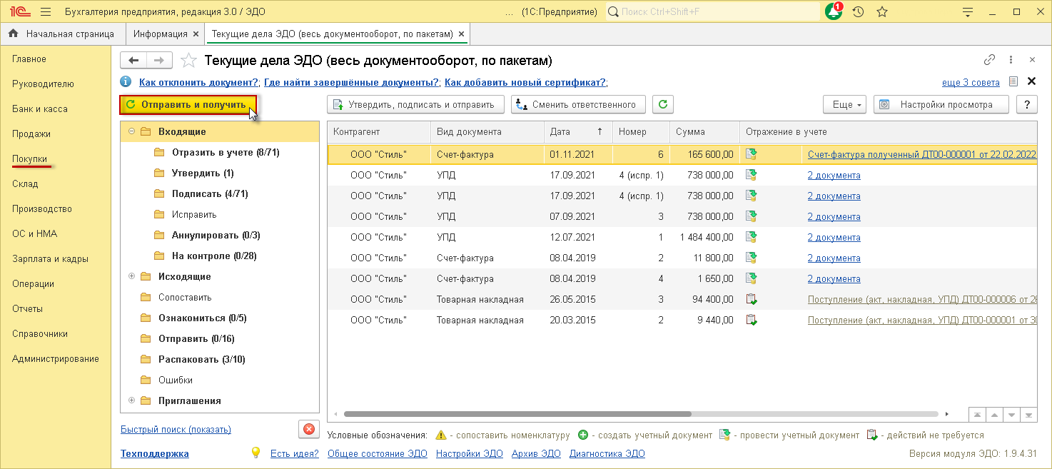 Получение электронного УПД(СЧФДОП) от продавца происходит по команде Отправить и получить из формы списка документов "Текущие дела ЭДО", открываемого по гиперссылка панели команд Текущие дела ЭДО (раздел Администрирование - подраздел Сервис или раздел Руководителю - подраздел Сервис, или раздел Продажи - подраздел Сервис) (рис. 1).