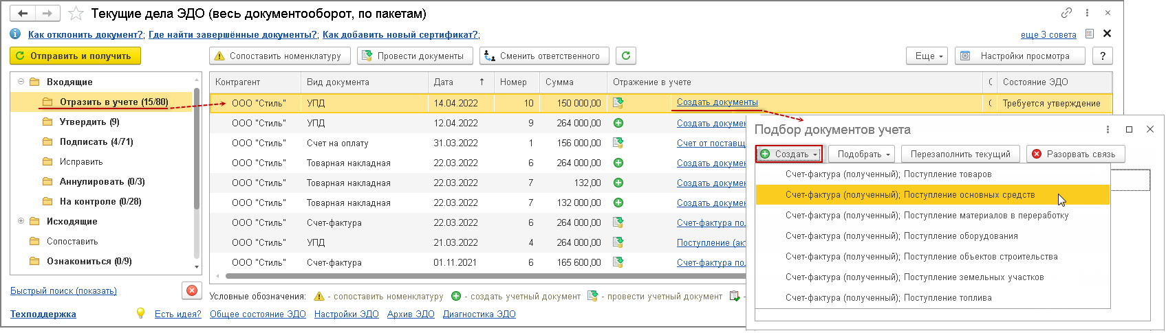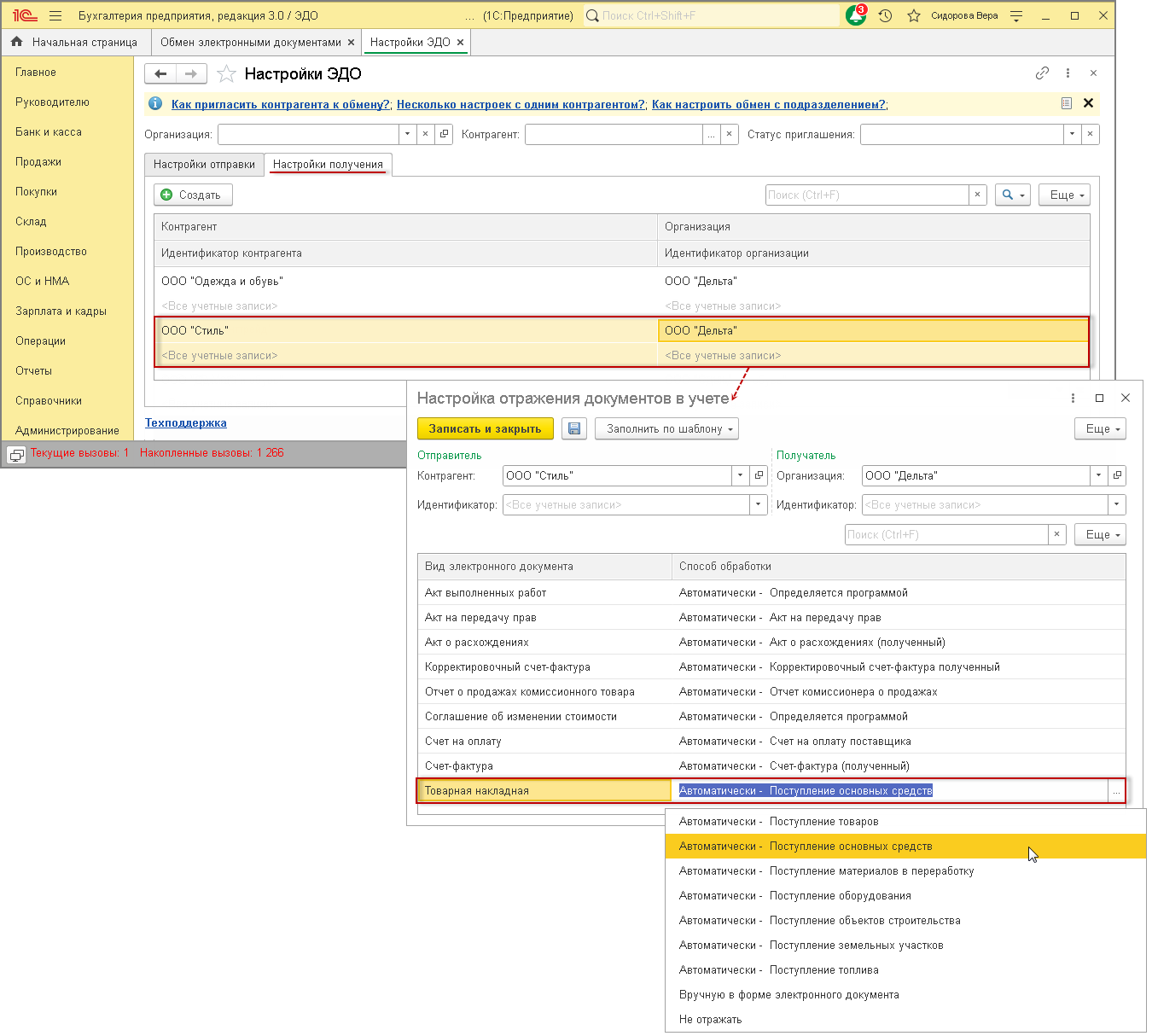 Способ обработки поступающих электронных документов в учетной системе зависит от настройки ЭДО (раздел Администрирование - Обмен электронными документами - Обмен с контрагентами - Настройки ЭДО).