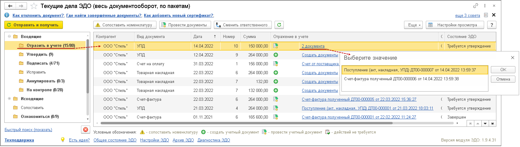 - по гиперссылке в графе "Отражение в учете" из списка входящих документов формы "Текущие дела ЭДО", выбрав соответствующее значение в открывающейся форме "Выберите значение" (рис. 3);