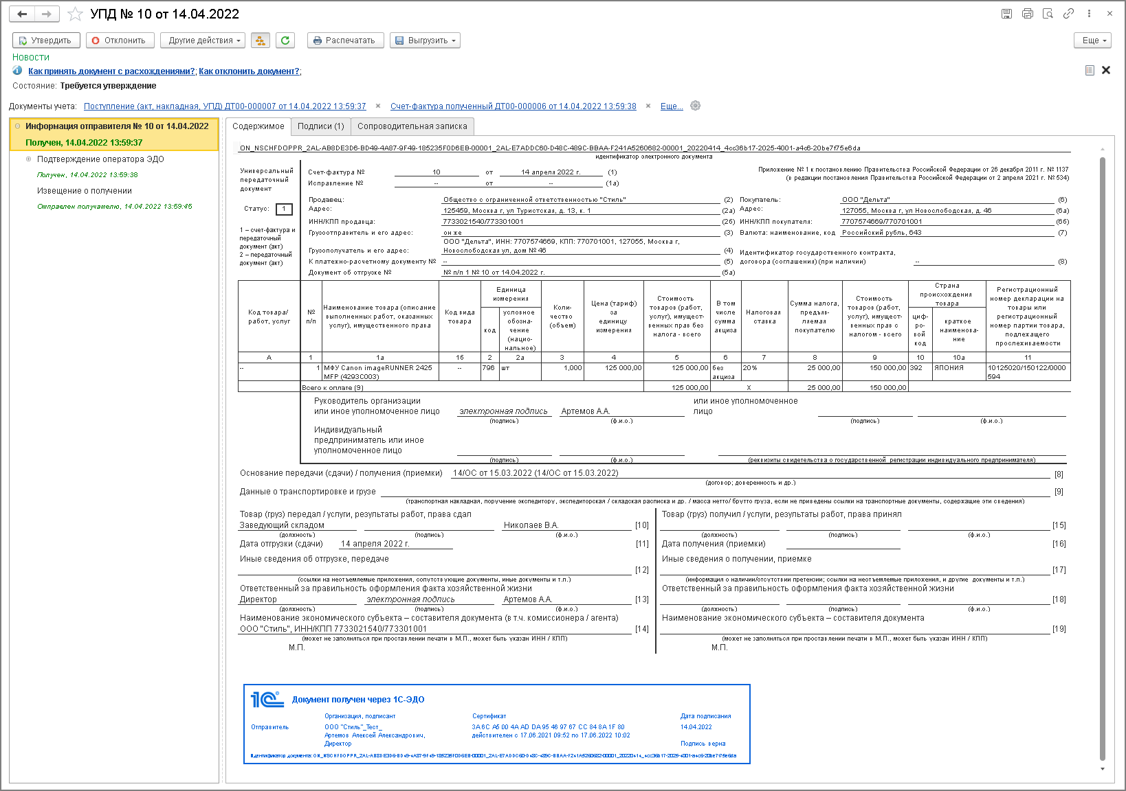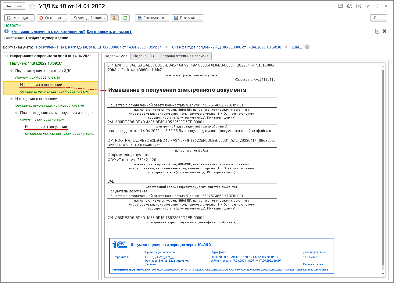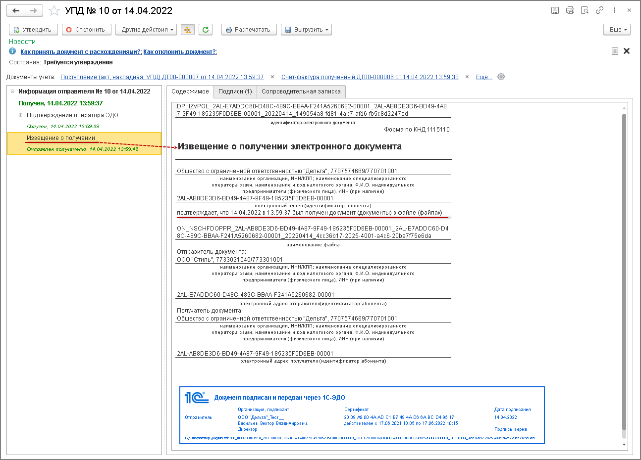 Если у текущего пользователя есть право подписи и сертификат подписи установлен на компьютере, то извещение о получении УПД(СЧФДОП) будет автоматически подписано и отправлено продавцу через оператора ЭДО. Если у текущего пользователя права подписи нет, то сформированное извещение будет направлено на подпись лицу, имеющему такое право.