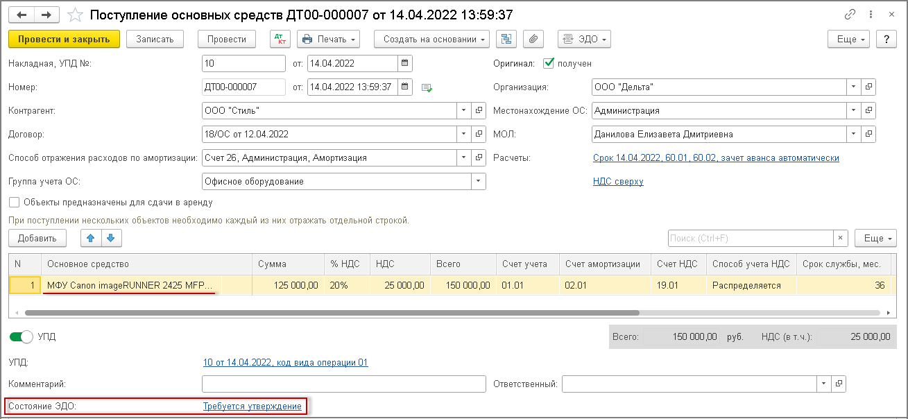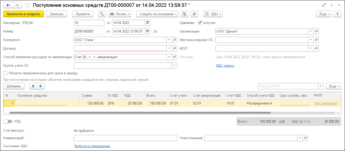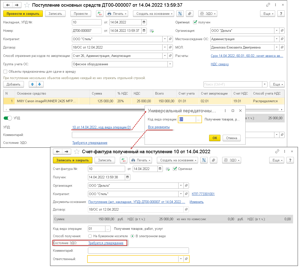 Организация ООО "Дельта" оформляет операцию по приобретению основного средства у ООО "Стиль", являющегося налогоплательщиком НДС, с применением электронного УПД (формата счета-фактуры и документа об отгрузке товаров).