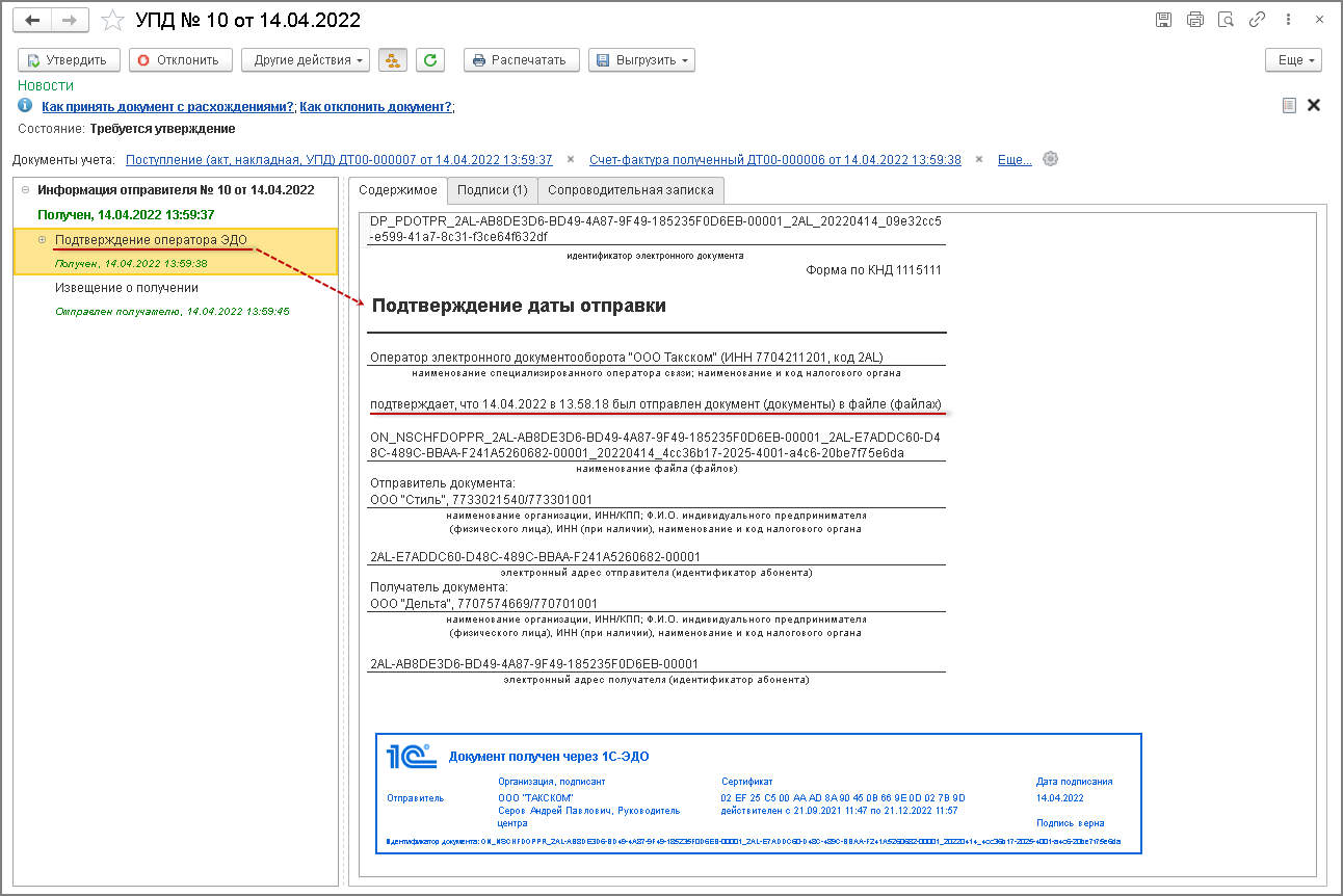 Просмотреть содержимое поступившего подтверждения оператора ЭДО можно, дважды щелкнув по соответствующей строке в форме просмотра поступившего электронного УПД(СЧФДОП) (рис. 9).