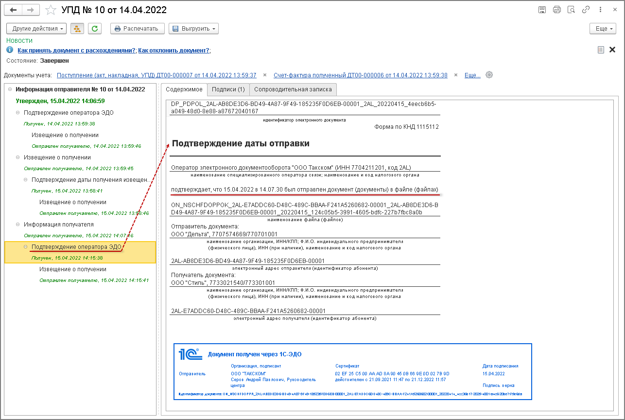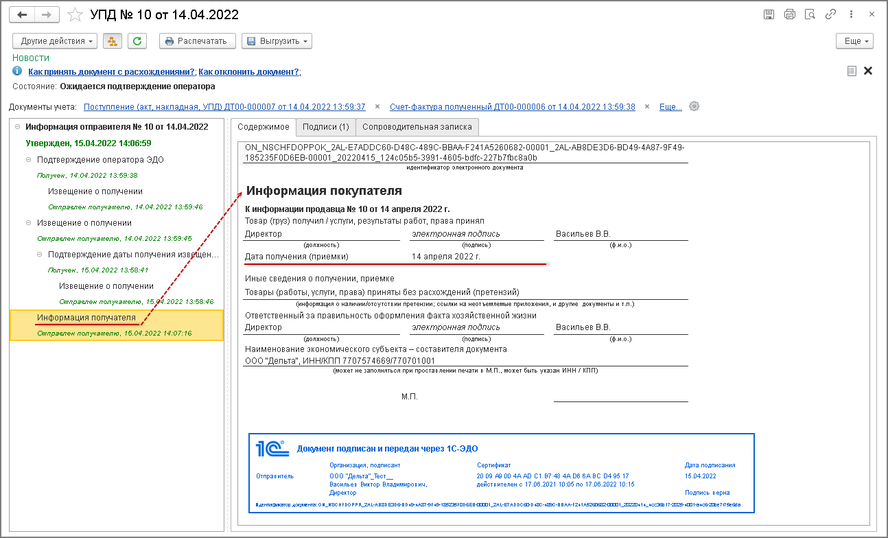 После поступления от оператора ЭДО подтверждения о получении УПД(информации покупателя) обмен электронным УПД(СЧФДОП) у покупателя будет завершен.