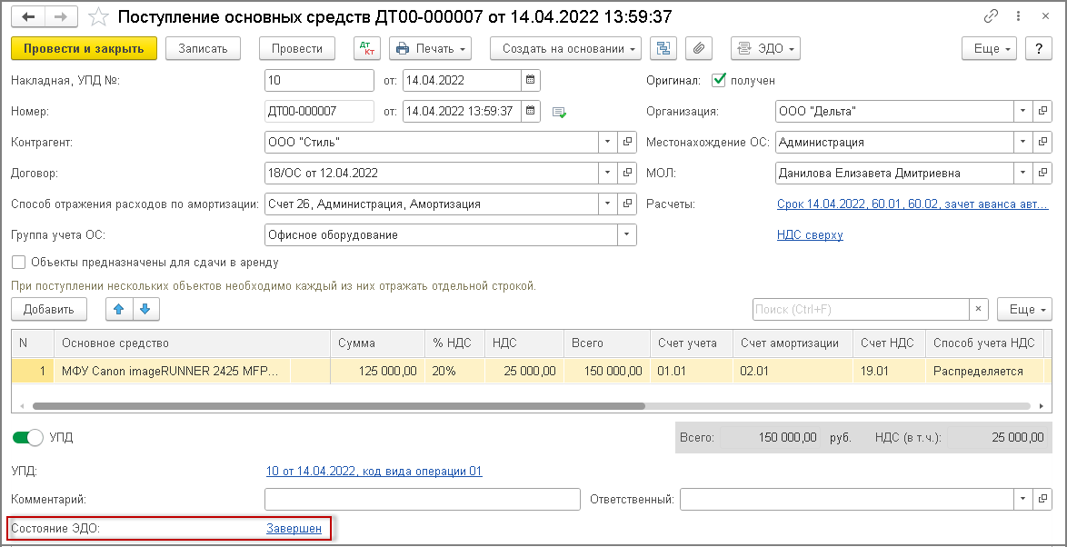 После завершения обмена электронным УПД(СЧФДОП) в строке "Состояние ЭДО" документа "Поступление основных средств" будет отражена гиперссылка Завершен.