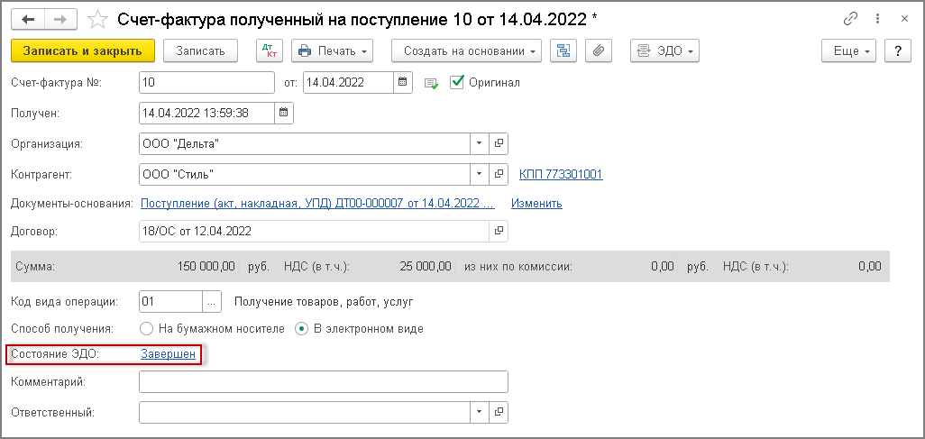 В поле "Получен" будет проставлена дата фактического поступления в организацию файла электронного счета-фактуры (электронного УПД(СЧФДОП)), т.е. 14.04.2022.