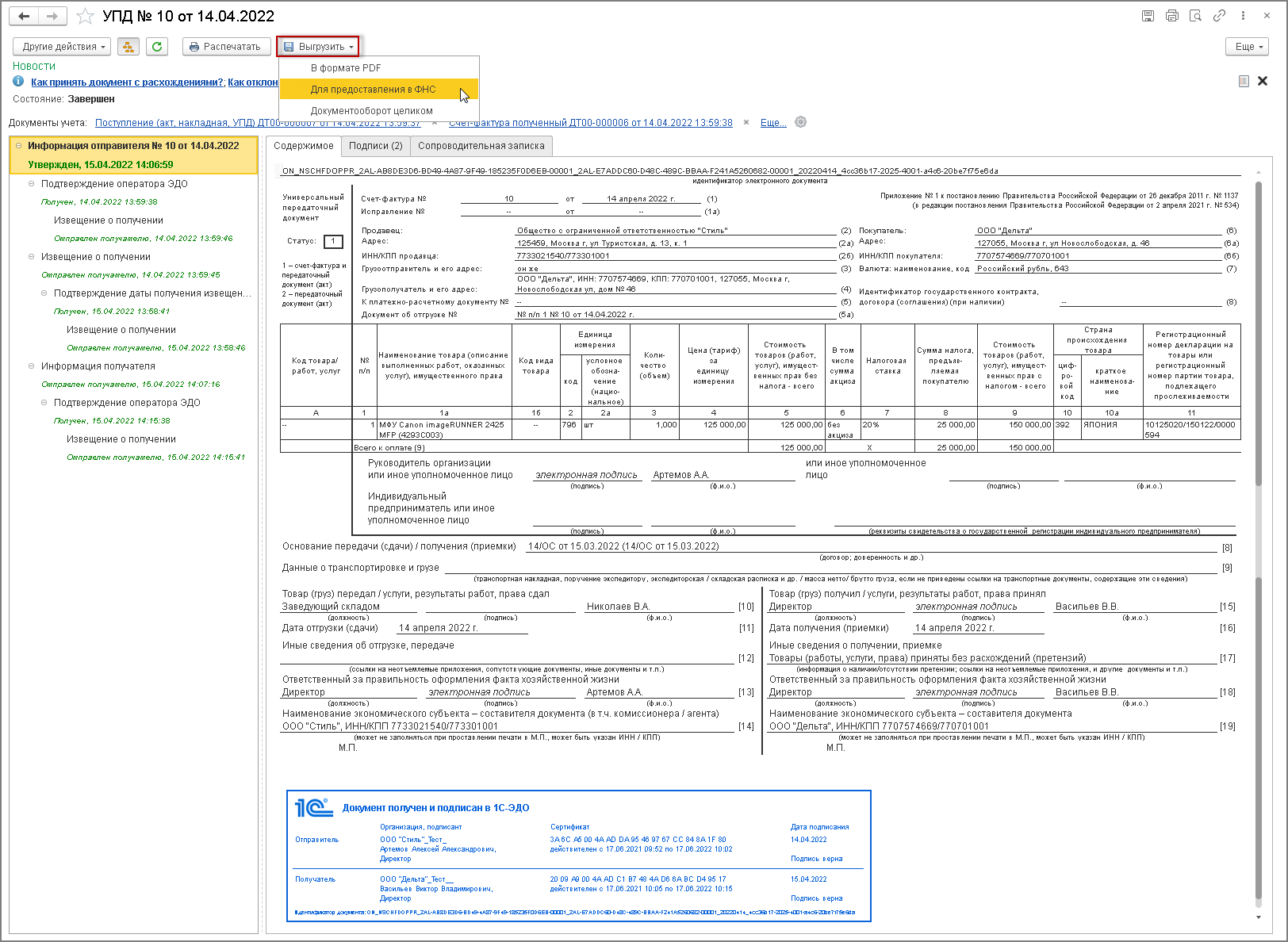 Также из формы просмотра по кнопке Выгрузить можно выполнить сохранение электронного УПД(СЧФДОП) (в формате PDF, для представления в ФНС, документооборот целиком).