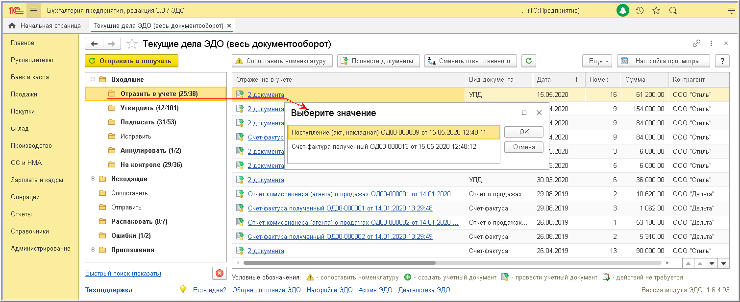 - по гиперссылке в графе "Отражение в учете" из списка входящих документов формы "Текущие дела ЭДО", выбрав соответствующее значение в открывающейся форме "Выберите значение" (рис. 3);