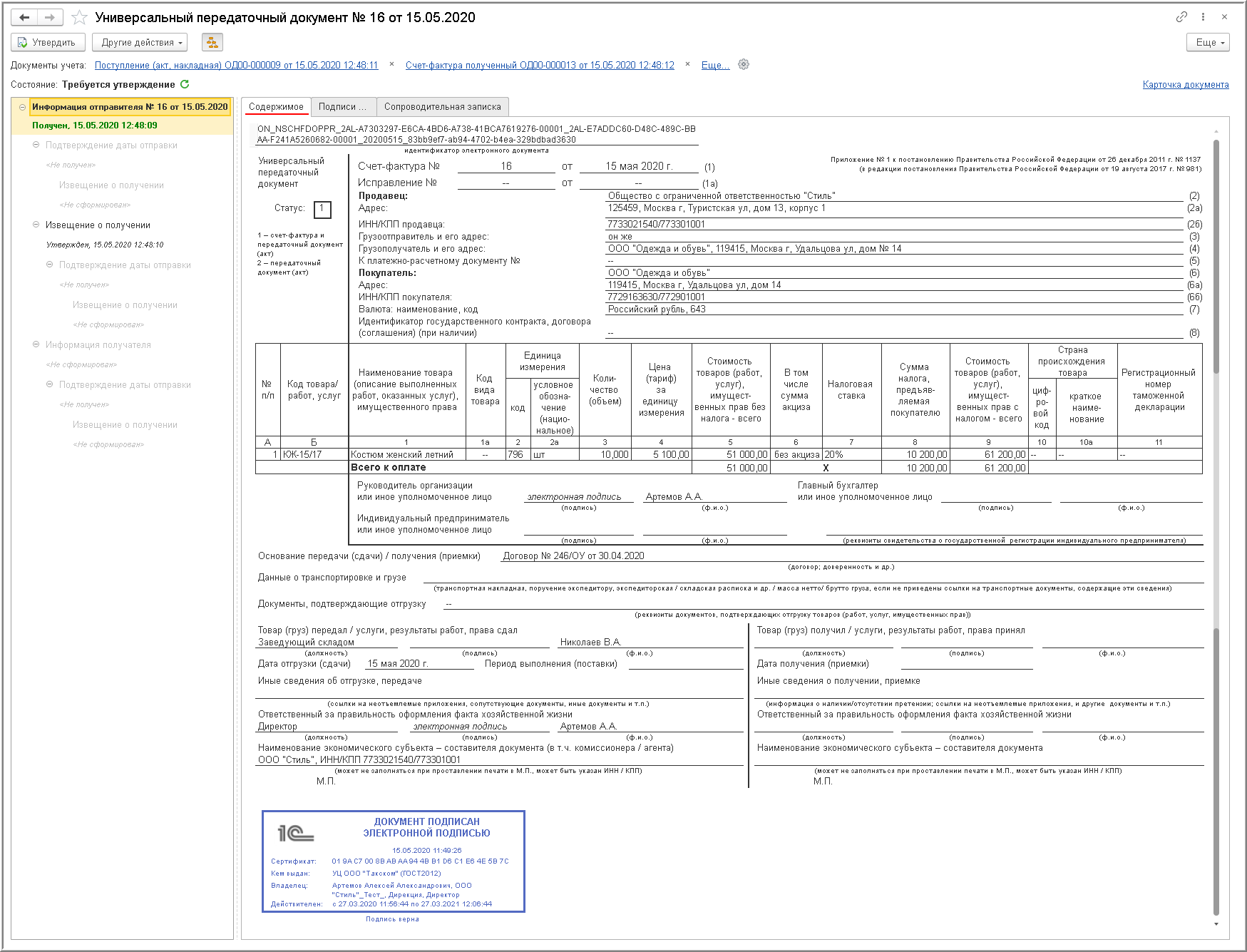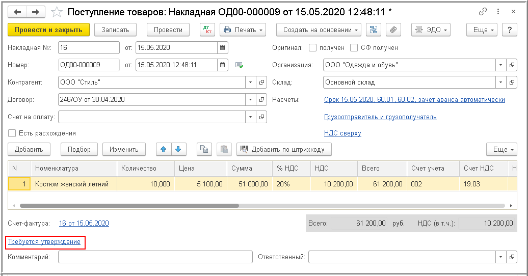 В информационной строке состояния электронного обмена документа "Поступление (акт, накладная)" будет установлено значение Требуется утверждение (рис. 5).