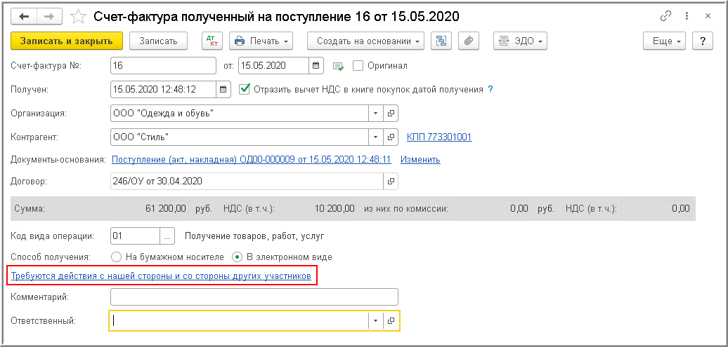 Состояние обменного процесса в отношении полученного электронного УПД отражается в информационной строке документа "Счет-фактура полученный", где будет установлено значение Требуются действия с нашей стороны и со стороны других участников.