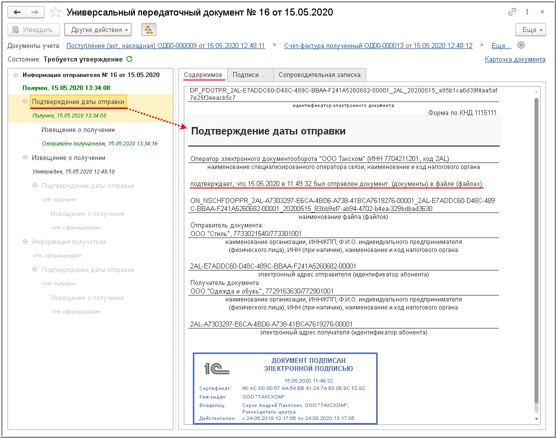 Процедура утверждения поступившего электронного УПД Порядком обмена не