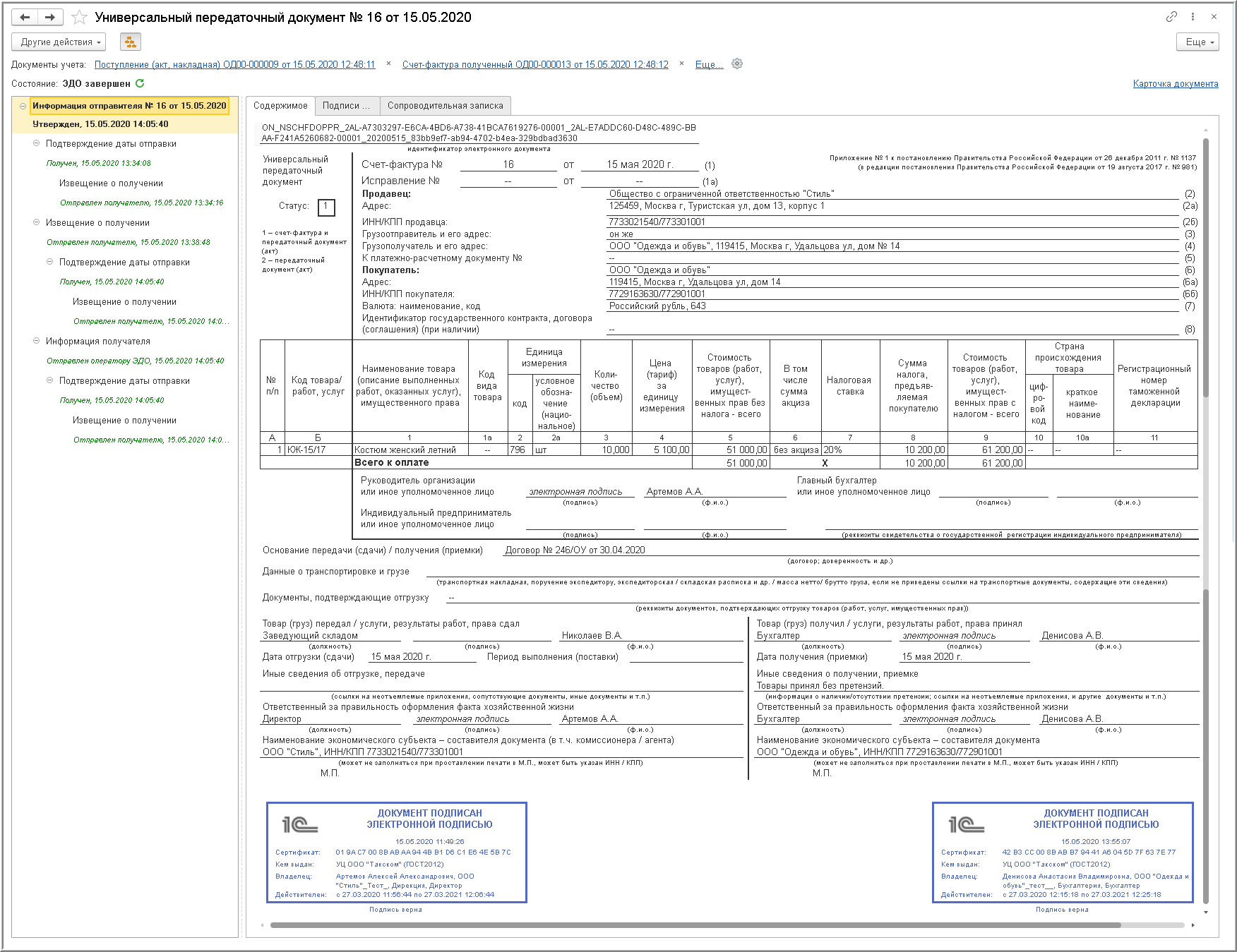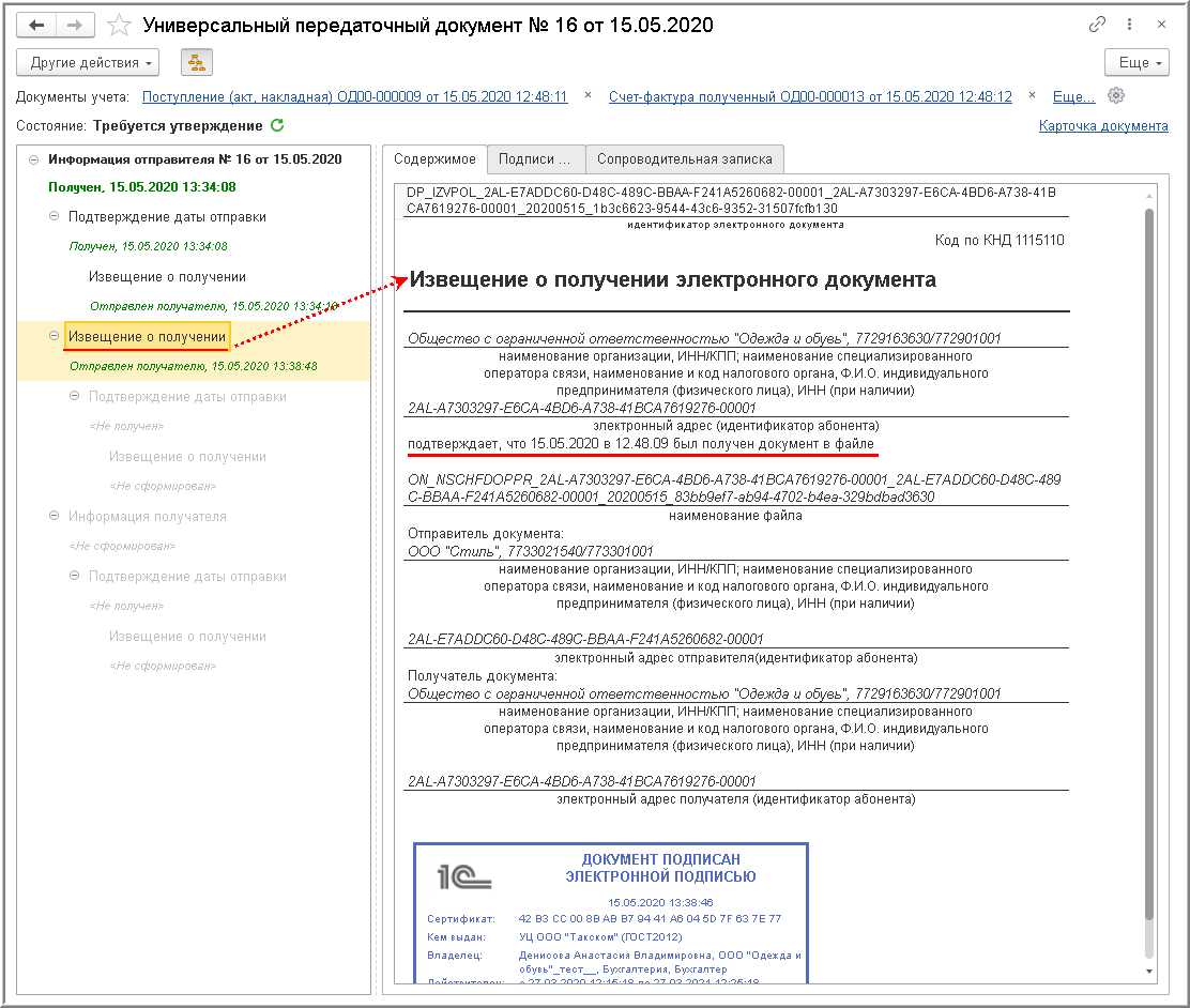 В этом случае в документе "Поступление (акт, накладная)" будет сохранена информация о проведенном обмене электронным УПД (электронным счетом-фактурой и электронным первичным документом).