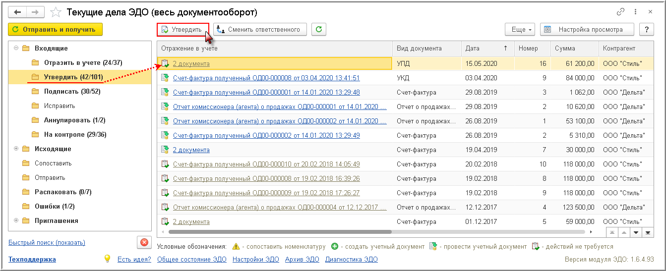 - выполнив команду Утвердить из формы просмотра поступившего электронного УПД (рис. 4).