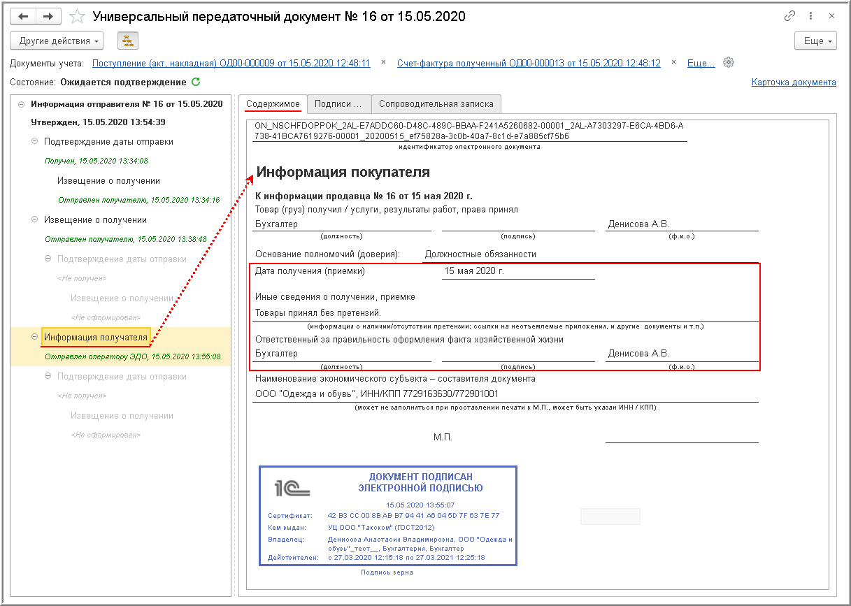 В сформированном УПД (информации покупателя) будет размещена информация о том, что поступившие товары получены покупателем.