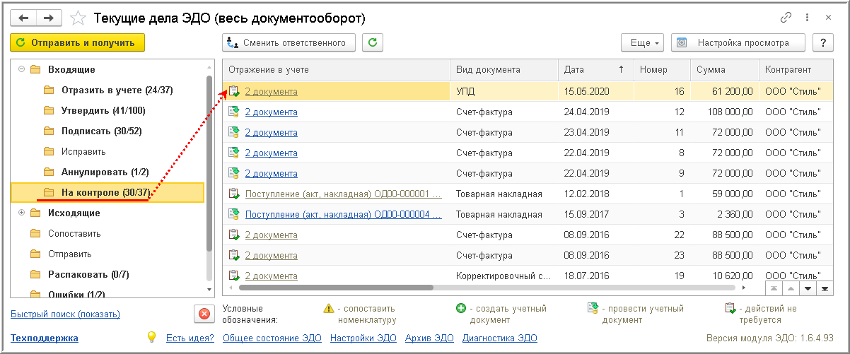 До момента получения этих служебных документов в списке "Текущие дела ЭДО" электронный УПД (информация покупателя) будет размещаться в папке "На контроле" списка входящих документов (рис. 11).