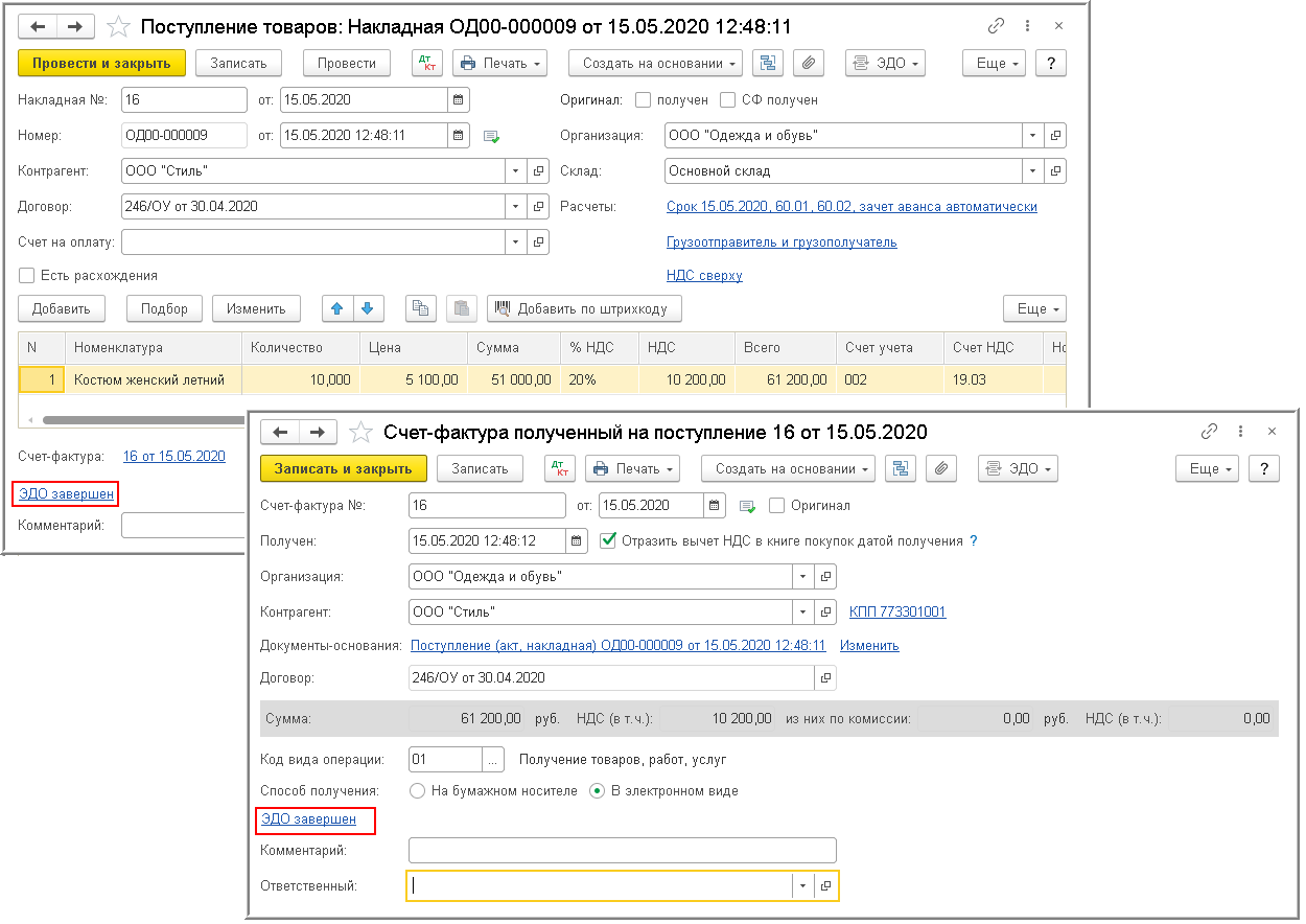 После завершения обмена электронным УПД в строке состояния документов "Поступление (акт, накладная) и "Счет-фактура полученный" будет отражена информация ЭДО завершен (рис. 12).