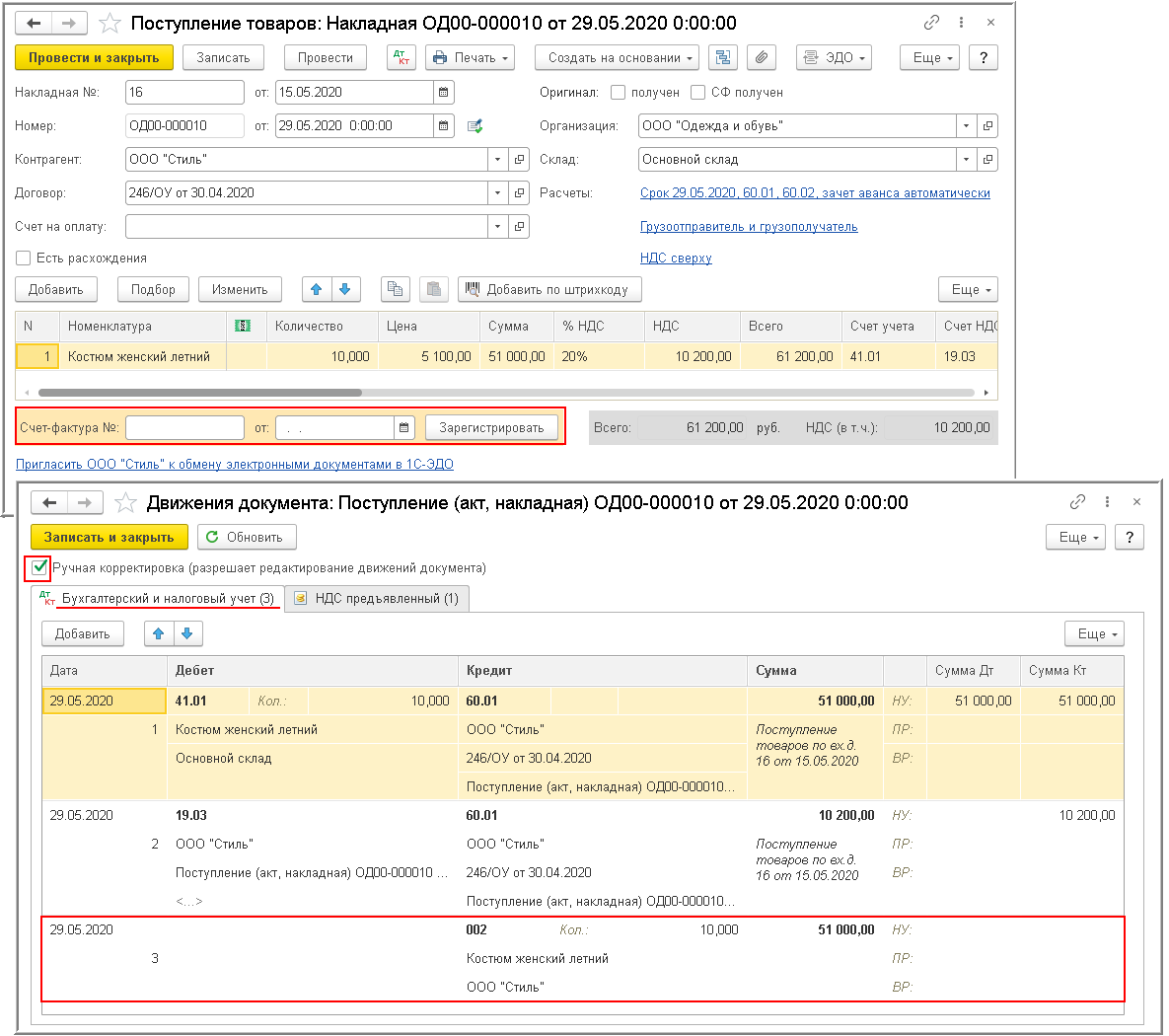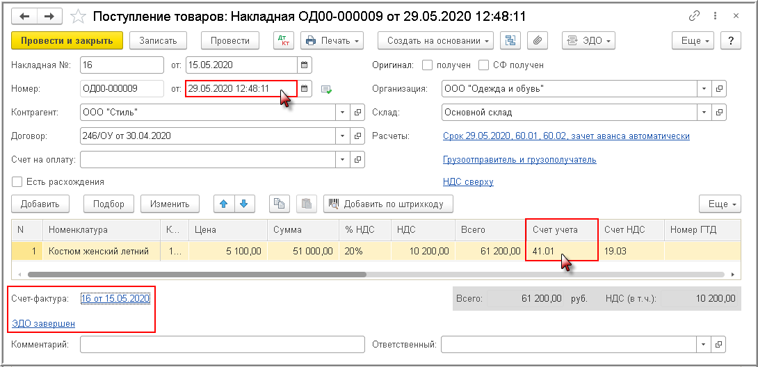 - внести исправление в созданный ранее на основании поступившего электронного УПД документ "Поступление (акт, накладная)" (рис. 12), скорректировав дату и счет учета товаров.
