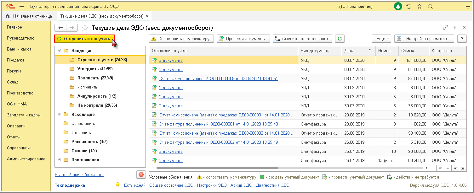 - из списка "Текущие дела ЭДО" по кнопке Отправить и получить (рис. 3);