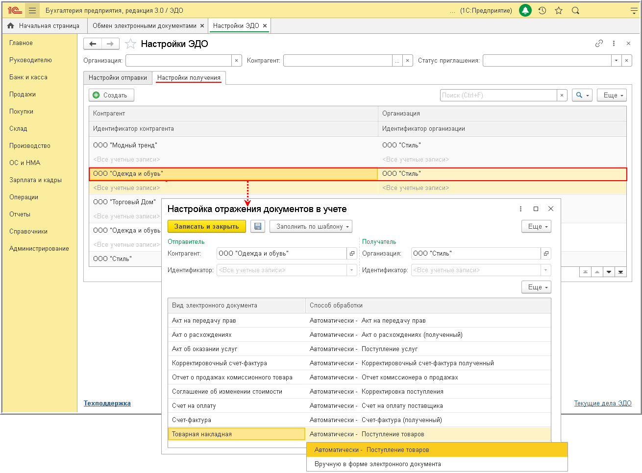 Для настройки отражения поступающих документов в учетной системе необходимо из формы "Настройки ЭДО" (закладка "Настройки получения"), дважды кликнув по строке, отражающей ЭДО с конкретным контрагентом, перейти в форму "Настройка отражения документов в учете" и установить способ обработки поступающих электронных документов: "Автоматически" или "Вручную в форме электронного документа" (рис. 2).