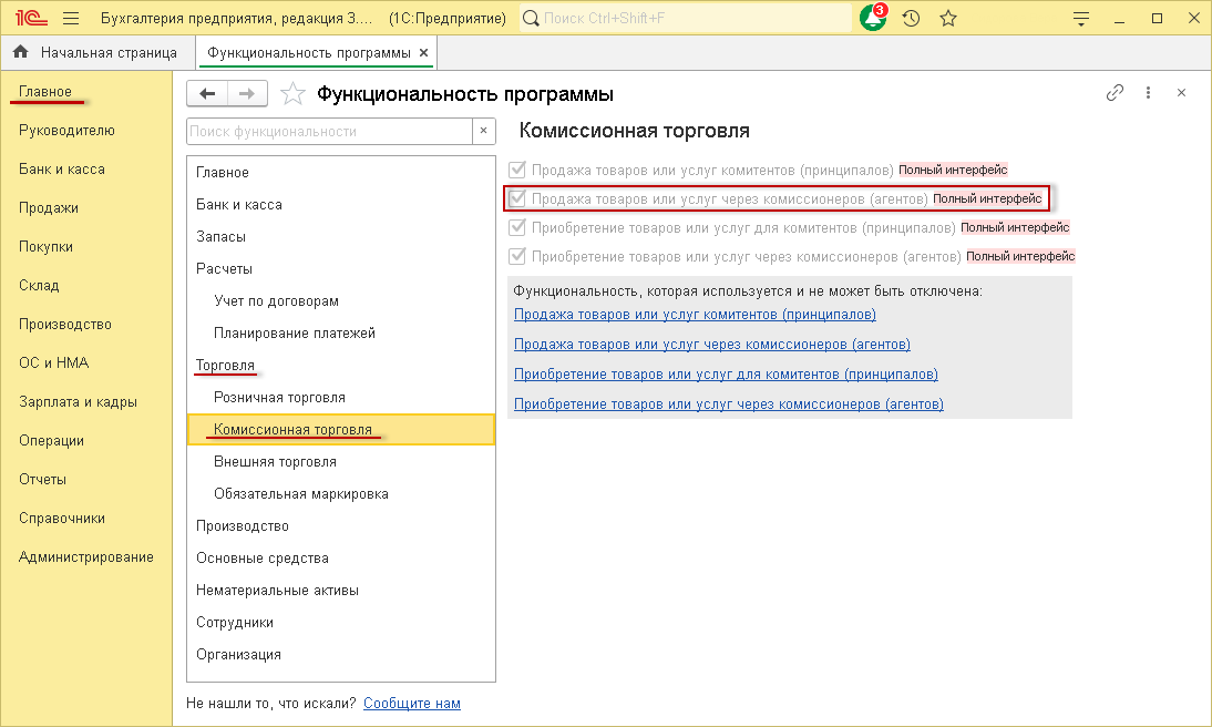 Организации ООО "Одежда и обувь", осуществляющей реализацию товаров по договорам комиссии, необходимо в справочнике "Функциональность программы" (раздел Главное - подраздел Настройки - Функциональность) в разделе "Торговля" - "Комиссионная торговля" проверить использование функциональности "Продажа товаров или услуг через комиссионеров (агентов)" (рис. 1).