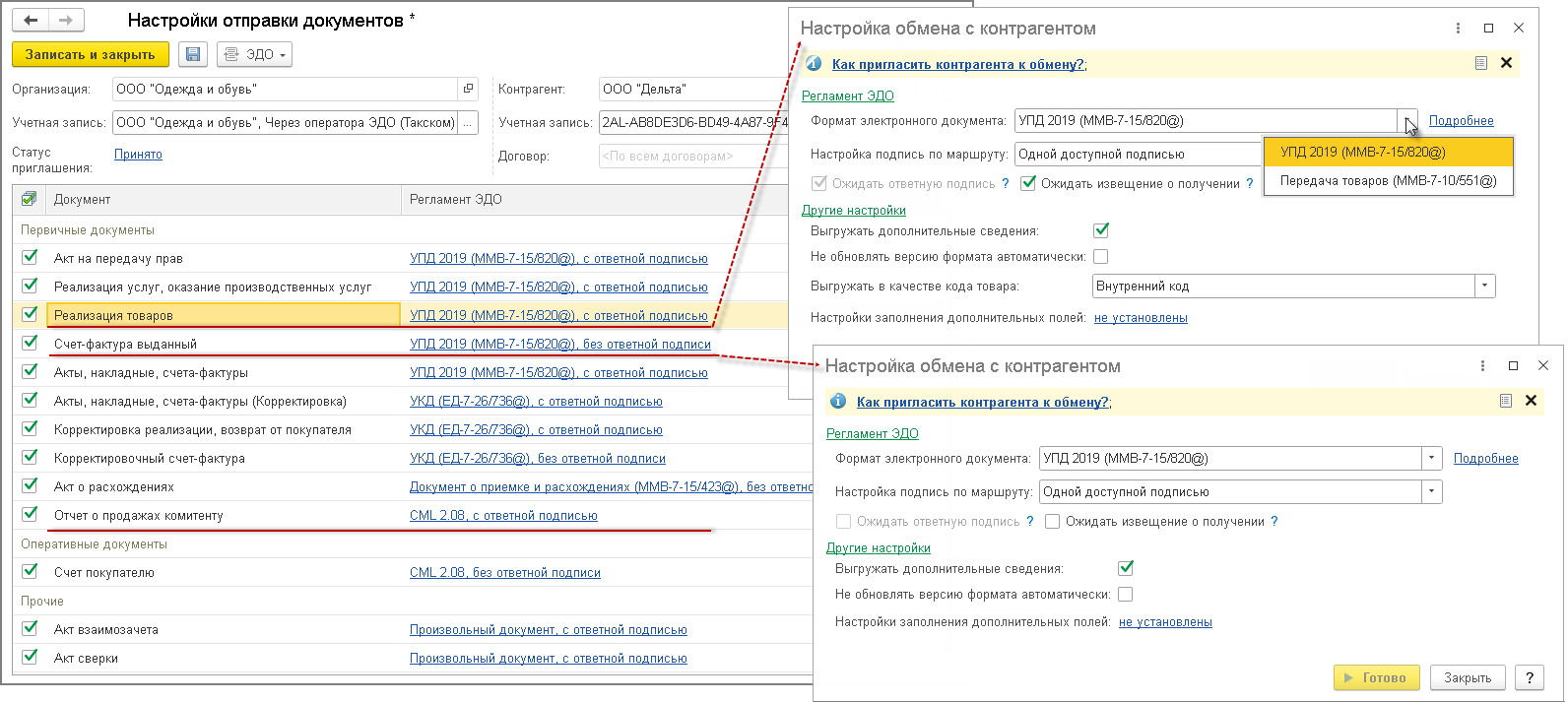 По гиперссылке в графе "Регламент ЭДО" формы "Настройки отправки документов" можно уточнить применяемый формат ЭД, порядок обмена, а также провести дополнительные настройки: