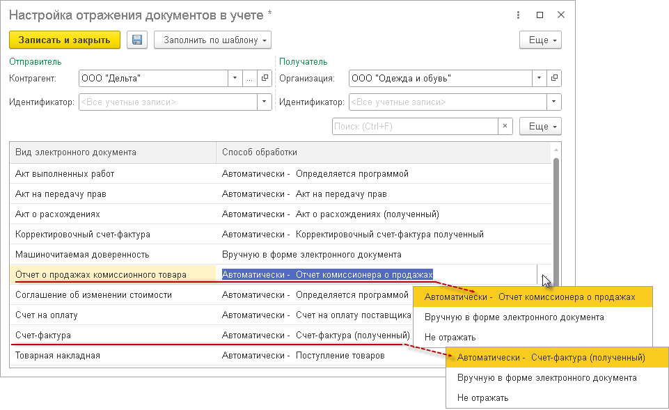 В настройках ЭДО (раздел Администрирование - Обмен электронными документами - Обмен с контрагентами - Настройки ЭДО) на закладке "Настройки получения" можно выбрать способ обработки поступающих электронных документов в учетной системе (рис. 4). По умолчанию устанавливается значение "Автоматически" с выбором соответствующего документа учетной системы.