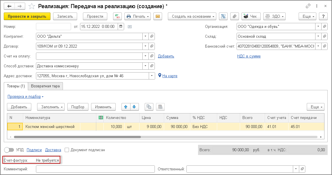 15 декабря 2022 года комитент передал комиссионеру на реализацию 10 шт. женских костюмов на сумму 90 000,00 руб.;
