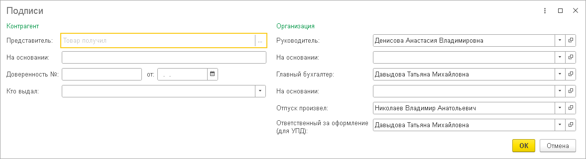 Так, например, если отгрузку товаров производит конкретное ответственное лицо (для данного примера - заведующий складом Николаев Владимир Анатольевич), то необходимо внести эту информацию в форму "Подписи" в поле "Отпуск произвел" (рис. 6).