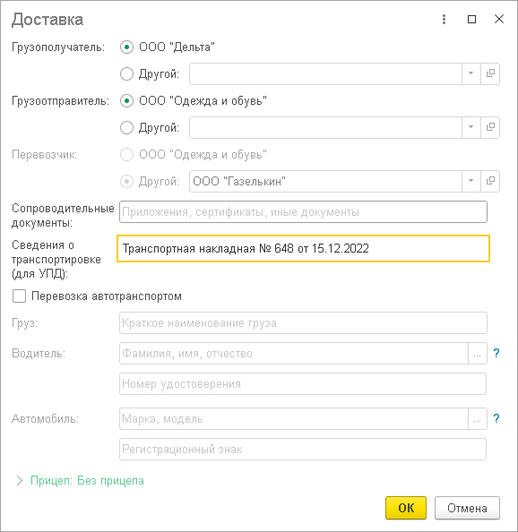 При доставке груза транспортной компанией в форме "Доставка" можно указать (рис. 7):