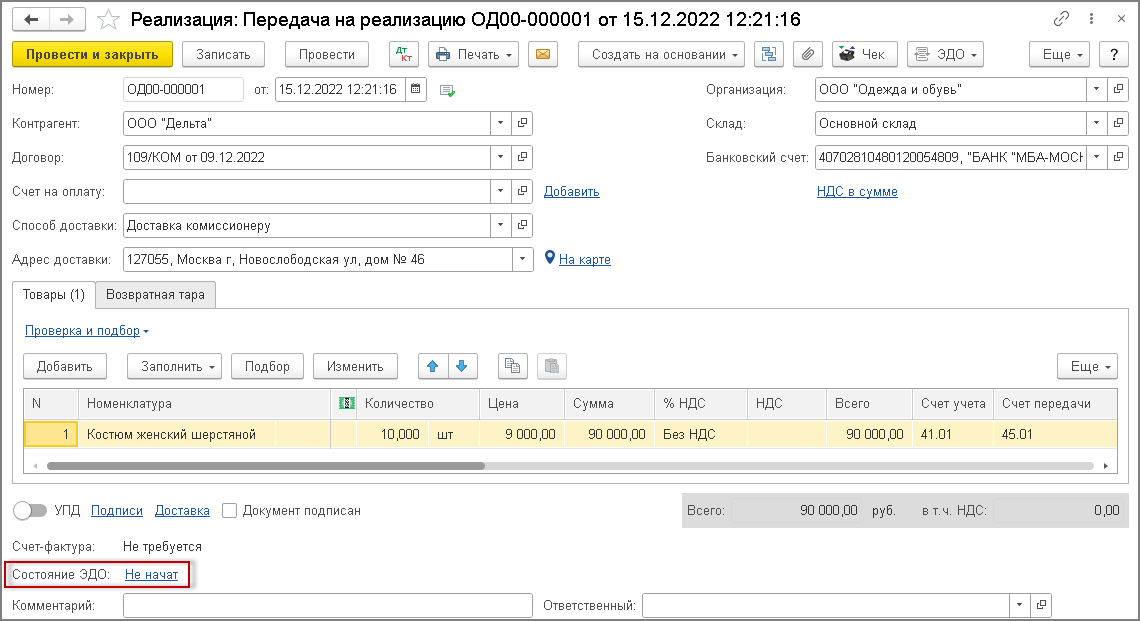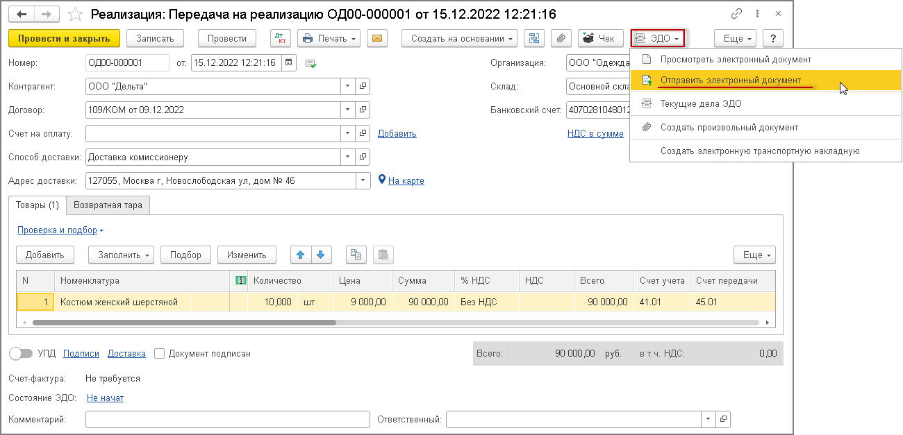 - Сформировать и отправить первичный документ на передачу товаров комиссионеру в электронном виде.