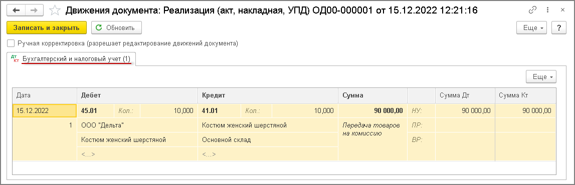 После проведения документа "Реализация (акт, накладная, УПД)" в регистр бухгалтерии вводится запись:
