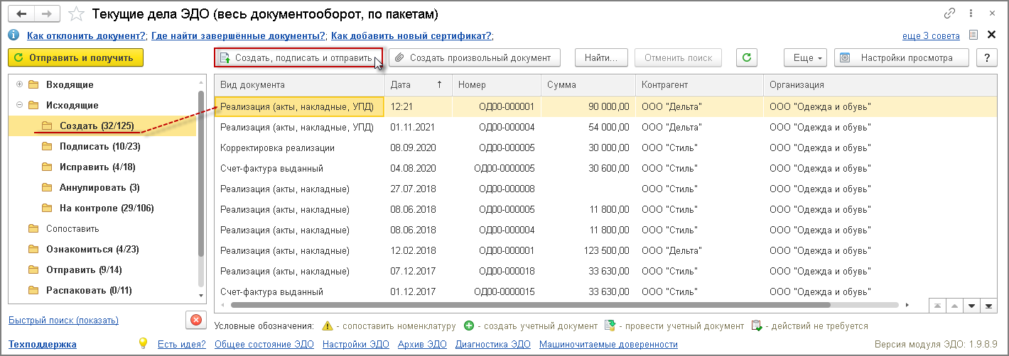 Непосредственная отправка сформированных и подписанных электронных документов зависит от того, как выполнена настройка электронного обмена.