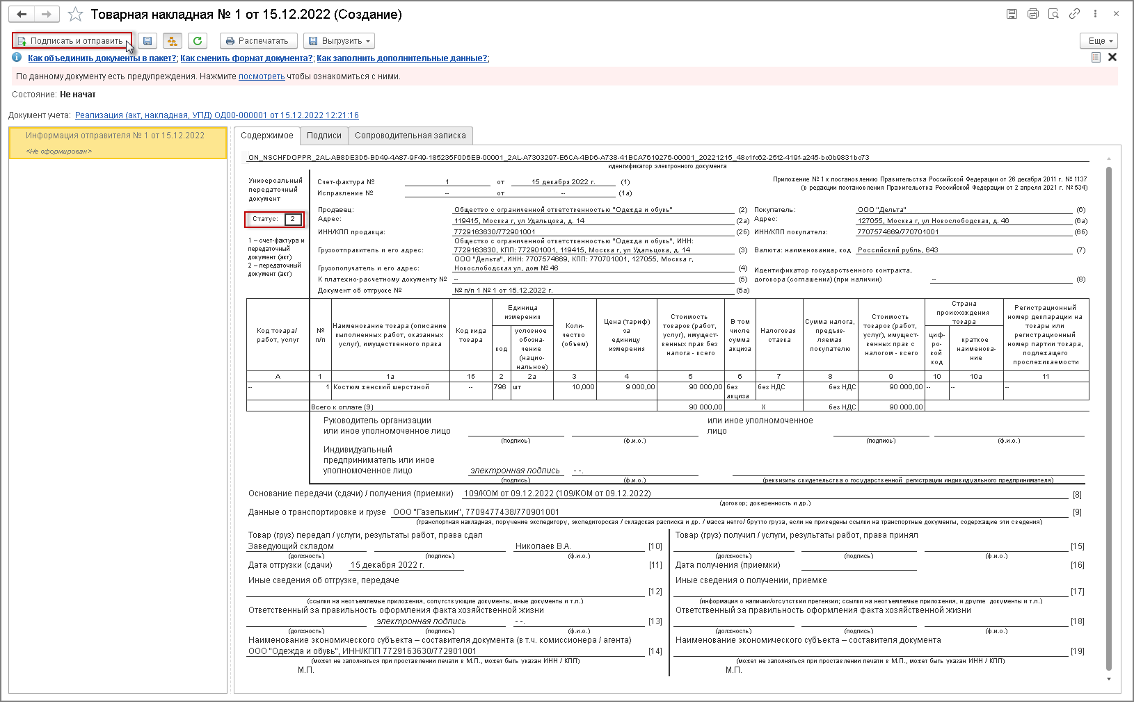При необходимости по гиперссылкам Подписи и (или) Доставка указывается дополнительная информация об операции передачи для оформления накладной (УПД).