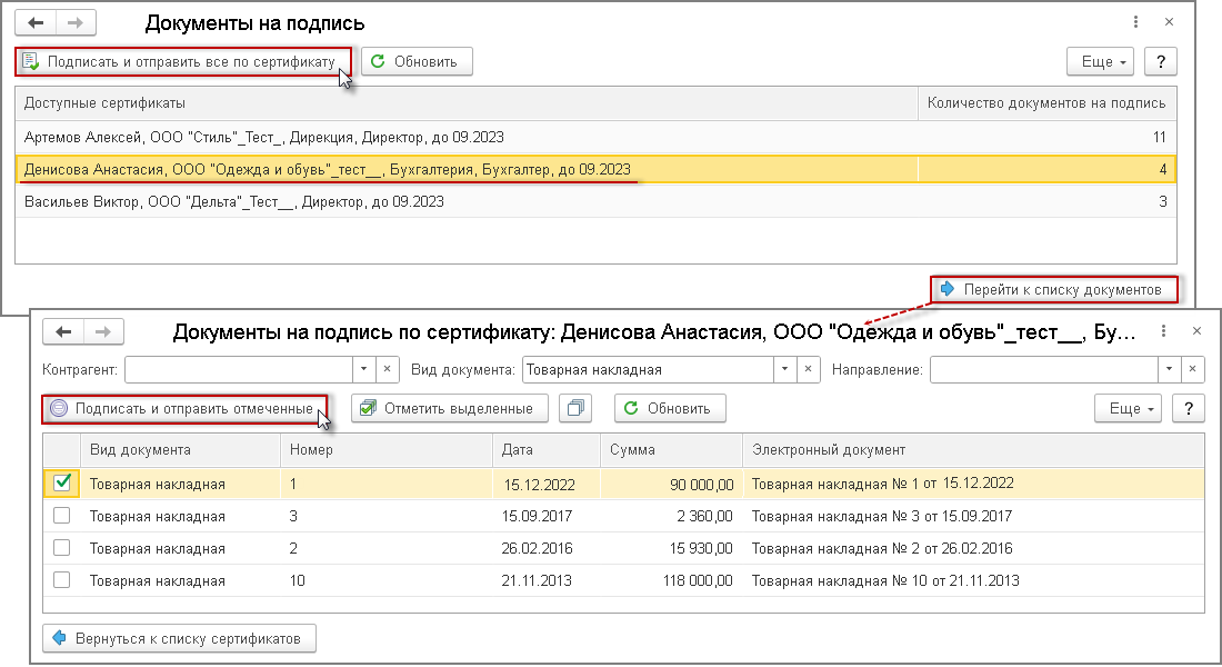 Кроме того, подписание сформированных электронных документов лицом, имеющим право электронной подписи, можно произвести из формы "Документы на подпись", в которой указываются сведения о доступном сертификате (доступных сертификатах) (раздел Администрирование - подраздел Электронные документы - список Документы на подпись или раздел Руководителю - подраздел Электронные документы - список Документы на подпись). Дважды щелкнув по активной строке списка доступных сертификатов или нажав на кнопку Перейти к списку документов, можно открыть список предназначенных для подписания документов "Документы на подпись по сертификату". В списке можно выбрать и отметить флажком определенные документы, подписать и отправить их по команде Подписать и отправить отмеченные (рис. 13).