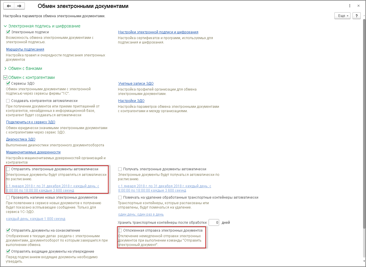 Также можно установить расписание получения электронных документов, выполнив соответствующую настройку параметров обмена электронными документами с контрагентами (раздел Администрирование - Обмен электронными документами) (рис. 14).